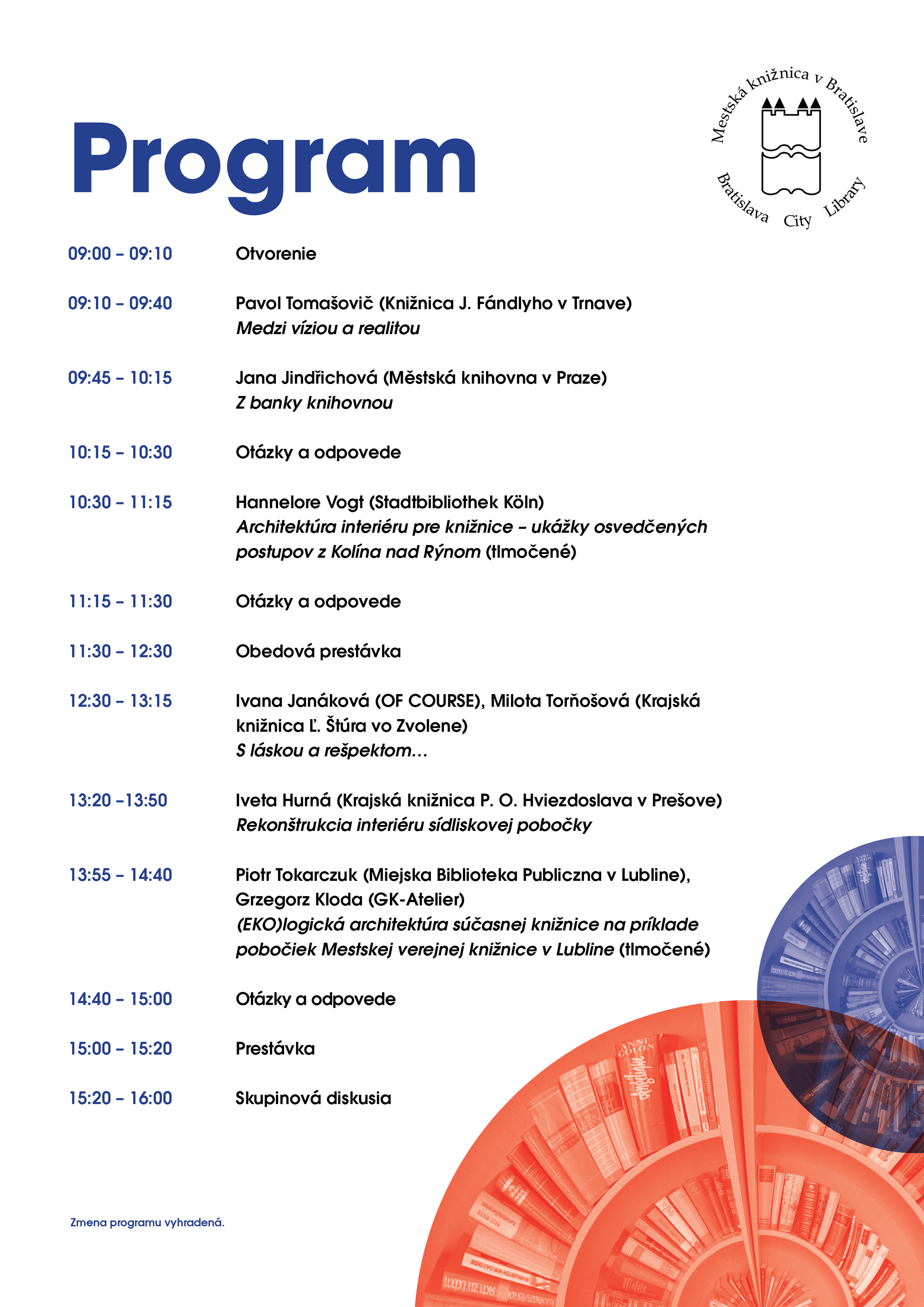 Proces dizajnového myslenia a posun od vnímania používateľa ako spolutvorcu priblíži príspevok Hannelore Vogt z Mestskej knižnice v Kolíne nad Rýnom. Oceňované a „zelené“ pobočky Mestskej verejnej knižnice v Lubline predstavia knihovník Piotr Tokarczuk a architekt Grzegorz Kloda. Ako prispôsobiť historické budovy požiadavkám súčasných návštevníkov ukážu príklady Knižnice J. Fándlyho v Trnave, Mestskej knižnice v Prahe či Krajskej knižnice Ľ. Štúra vo Zvolene. A ako sa s výzvou zastaralej sídliskovej pobočky v stiesnených priestoroch popasovali v Prešove, predstaví Iveta Hurná z Krajskej knižnice P. O. Hviezdoslava.