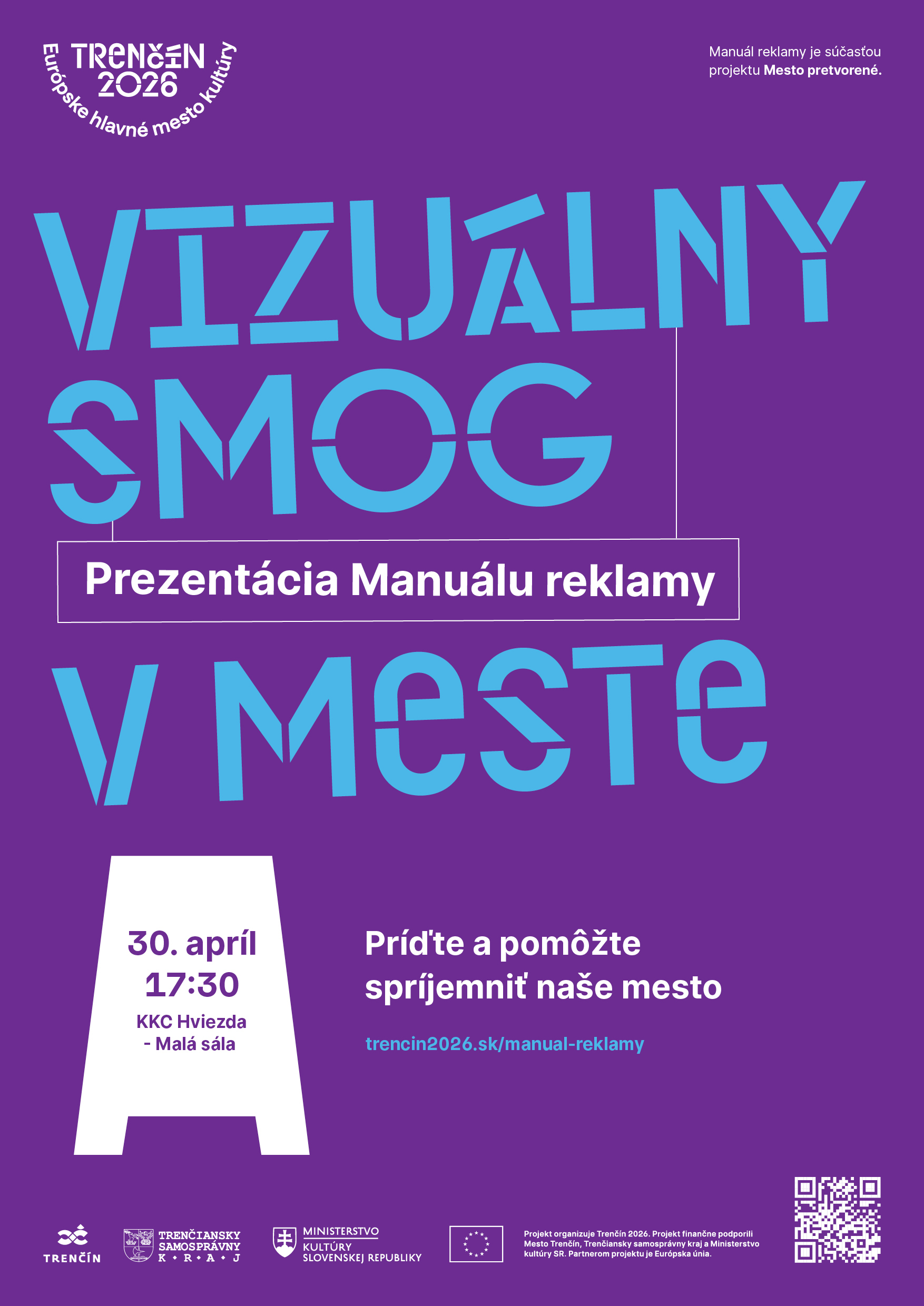 Verejná prezentácia Manuálu reklamy mesta Trenčín sa uskutoční 30. apríla o 15:30 hod. v Malej sále Kultúrno-kreatívneho centra Hviezda. Súčasťou večera budú prezentácie expertiek na verejný priestor a vizuálny smog a spoločná diskusia. Hosťkami podujatia budú Veronika Rút Fullerová, Kristína Drápalová, Kristína Šebejová a Anna Ulahelová. Diskusiu bude viesť Omar Mirza, mestský kurátor pre mesto Trenčín.