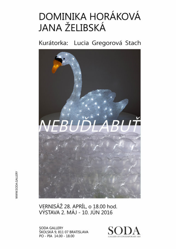 The cooperative project of Jana Želibská and Dominika Horáková titled Nebuďlabuť (Don't be Naïve) is a creative intercourse of two mature artists.Their common feature is a similar kind of ironical detachment by which each one expresses their views on serious subjects rather light-heartedly, uninhibitedly, wittily and as if en passant, using their own medium and visual language. The exhibition exploits the juxtaposition of the pathos addressing the viewers' emotions (in currently historicising art of installation) with banality as a sensitivity characteristic for the modernity and contemporaneity (in photography). Banal, vernacular, domestic and anti-heroic stands here against rigid, romantic and heroic. Želibská's video art installation links by its syntax with the art works from nineties such as Last Feeding (1992) or Impaired Watering(1991).The hens were substituted with more grandiose swans although ameliorated, illuminated, 'beautiful'. The grotesque last supper was replaced by the swan song – at the background of the monumental landscape with surprising sights. Since sixties realised that the art is outside in the streets and life, on the magazines cover-pages and in fashion, in films which seem low, in cheap paperbacks and marketing pictures (Oscar Massota), Pop as a contemporary art is not over yet. It seeks new modes, hunts in indefinitely multiplying pictures and videos on the internet or among temptations of ever-various objects and activities cheaply and hastily satisfying the people's lust for illusions and individualism, beauty and eternal youth. Post-industrial Pop has its vernacular, albeit dark side, the culprit of which is Dominika Horáková's contemporary photography: in empty packaging, abandoned spaces and items displaced from their commonplaceness she shows the spirituality of present days as a hybrid between 'Western' emptiness as a lack and 'Eastern' purifying emptiness which is a condition of the new beginnings.