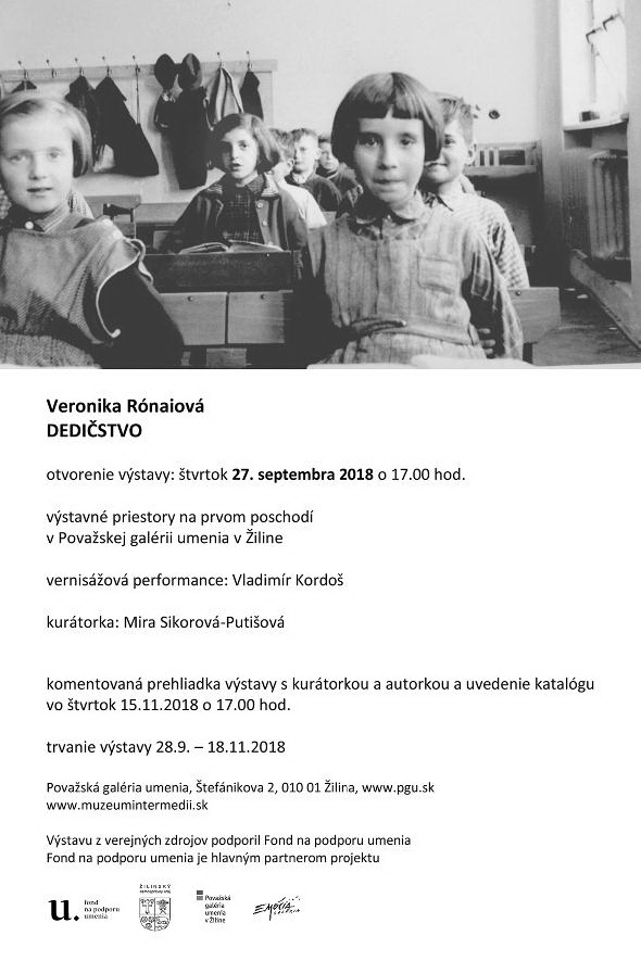 Veronika Rónaiová vstupuje na pôdu Považskej galérie umenia v Žiline s väčším projektom Dedičstvo po pätnástich rokoch, ktoré prešli od jej výstavy (malá) retrospektíva v roku 2003, a práve táto výstava v mnohom predznačila smerovanie tvorby autorky - jej ďalšie formáty i koncepcie.