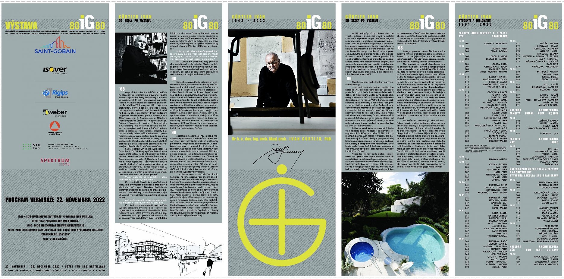 Dr.h.c., doc. Ing. arch. Akad. arch. Ivan Gürtler, PhD. sa dožíva životného jubilea 80 rokov. Za obdobie svojej pedagogickej vysokoškolskej činnosti v rokoch 1991 až 2018 pôsobil na rôznych vysokých školách a univerzitách, medzi ktorými je aj FAD STU v Bratislave, VUT v Brne, katedrách architektúry TUKE v Košiciach a SvF VŠB-TU v Ostrave. Počas svojej doby pôsobenia vychoval 123 diplomantov v odbore profesie architekt. Tento počet v súčasnosti predstavuje komunitu, ktorá svojím potenciálom do značnej miery predstavuje smerovanie nielen súčasnej architektúry na Slovensku ale i v zahraničí. Pri tejto príležitosti životného jubilea projekt „80IG80“ predstavuje snahu predstaviť jubilantových študentov ich realizovanými vrcholnými stavbami slovom, výkresovou dokumentáciou a fotografiou na výstave, ktorá sa bude konať od 22. novembra do 9. decembra vo foyer FAD STU v Bratislave. Výstava svojím formátom voľne nadväzuje na výstavu konanú v roku 2009 pod názvom MADE IN IG.