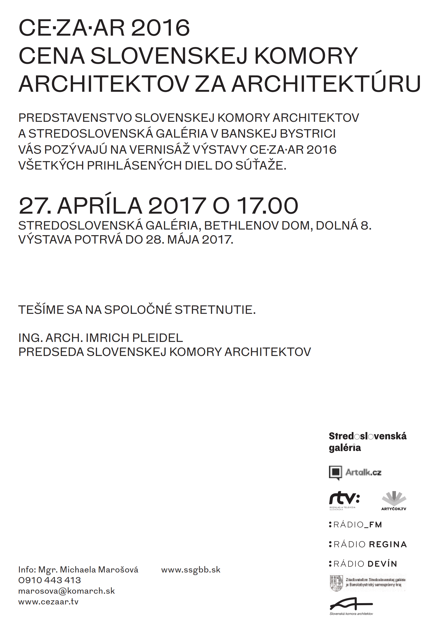 Vážené kolegyne, vážení kolegovia, dovoľujem si Vás pozvať v mene predstavenstva SKA na vernisáž výstavy CE∙ZA∙AR 2016 všetkých prihlásených, nominovaných a ocenených diel, ktorá sa uskutoční 27. apríla 2017 o 17:00 hod. v Stredoslovenskej galérii (Bethlenov dom, Dolná 8). Výstava potrvá do 28. mája 2017.