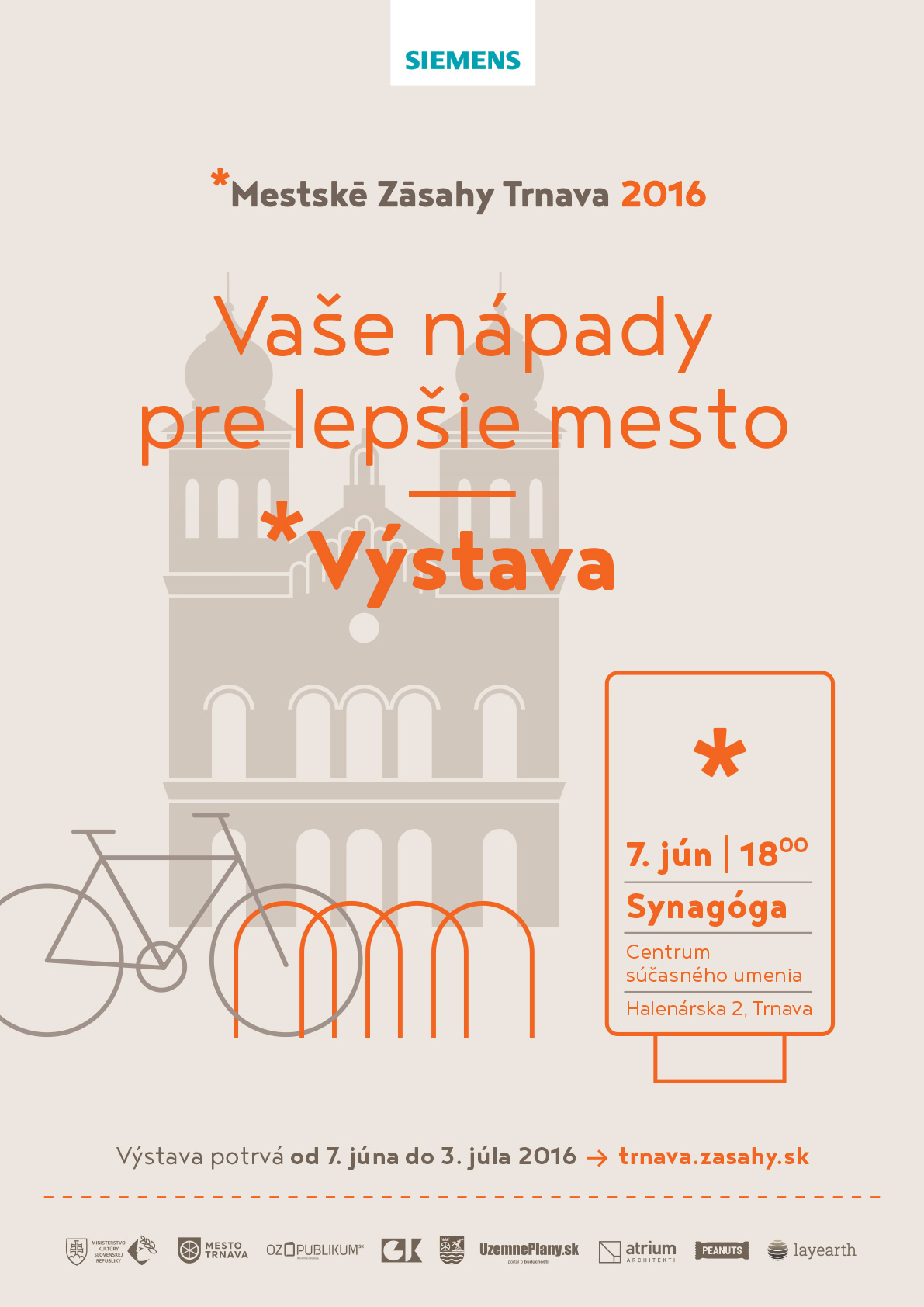 V Synagóge – centre súčasného umenia bude v utorok 7. júna o 18:00 otvorená výstava k iniciatíve Mestské zásahy Trnava 2016, ktorá od decembra minulého roka zbierala nápady i konkrétne projekty od odbornej a laickej verejnosti k tomu, ako vylepšiť naše mesto. Na výstave bude odprezentovaných všetkých 50 prijatých projektov.