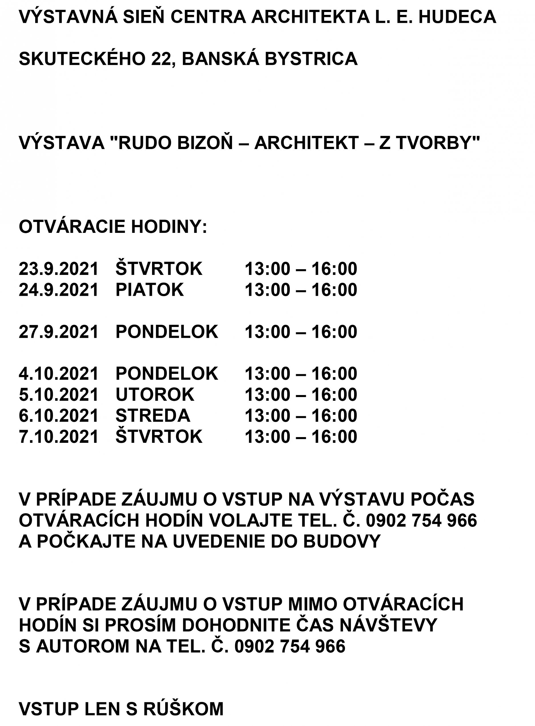 Pri príležitosti životného jubilea (80 rokov) Ing. arch. Rudolfa Bizoňa, pozýva Centra architekta L. E. Hudeca (C.A.L.E.H.) na výstavu jeho tvorby. Výstava bude prebiehať v priestoroch C.A.L.E.H. v Banskej Bystrici na ulici Skuteckého 22.