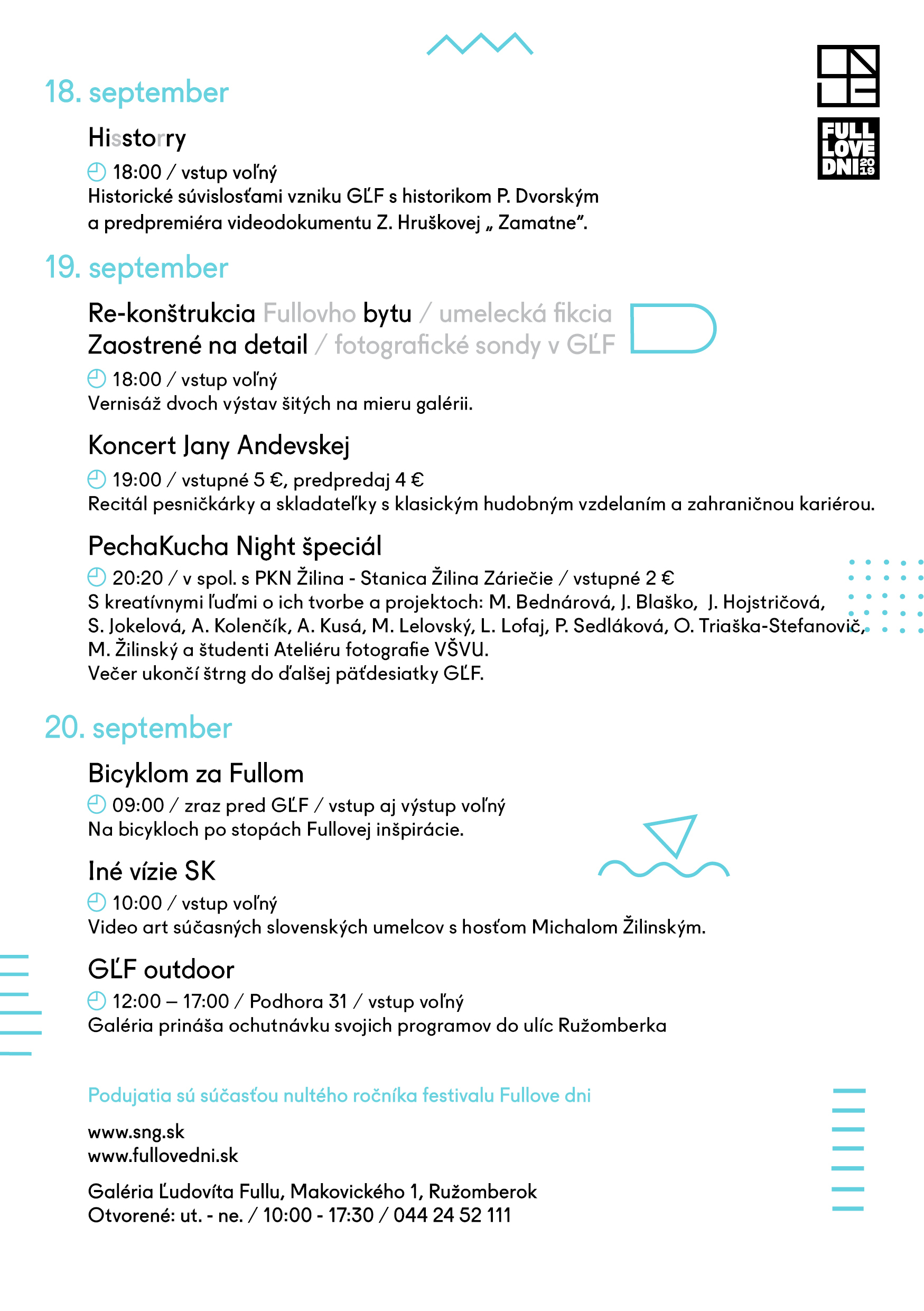 Oslavy 50. výročia založenia GĽF sú súčasťou nultého ročníka viacdňového mestského festivalu Fullove dni, ktoré pokračujú v exteriéri mesta v parku Štefana Hýroša vystúpením folklórnych súborov Liptov a Liptáčik a kapely RK Jazz Band. Po nich príde na rad premiéra filmu Zuzany Hruškovej „Zamatne“, v ktorom vyspovedala pamätníkov na Fullu a začiatky galérie. Na pódiu sa predstaví aj mladý reper Ley Skeleton (Leonard Lofaj), ktorý zložil k filmu soundtrack inšpirovaný tvorbou Ľudovíta Fullu. Po ňom príde Banda a večer vyvrcholí vystúpením kapely Vidiek.