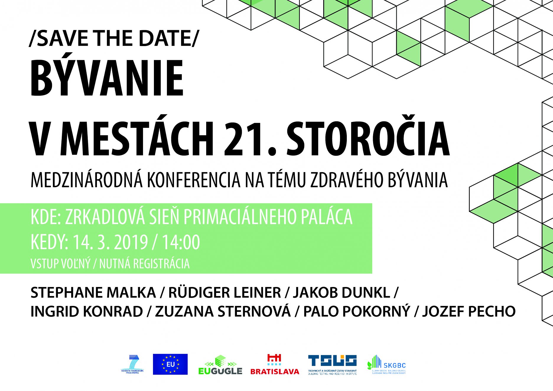 pozývame Vás na medzinárodnú konferenciu "Život v mestách 21. storočia". Podujatie organizuje Útvar hlavnej architektky mesta Bratislava, koná sa 14. marca 2019 v Zrkadlovej sieni Primaciálneho paláca. Podujatie je organizované v rámci osvetovej kampane “Bývajme zdravo!“, ktorá je súčasťou projektu EU GUGLE.