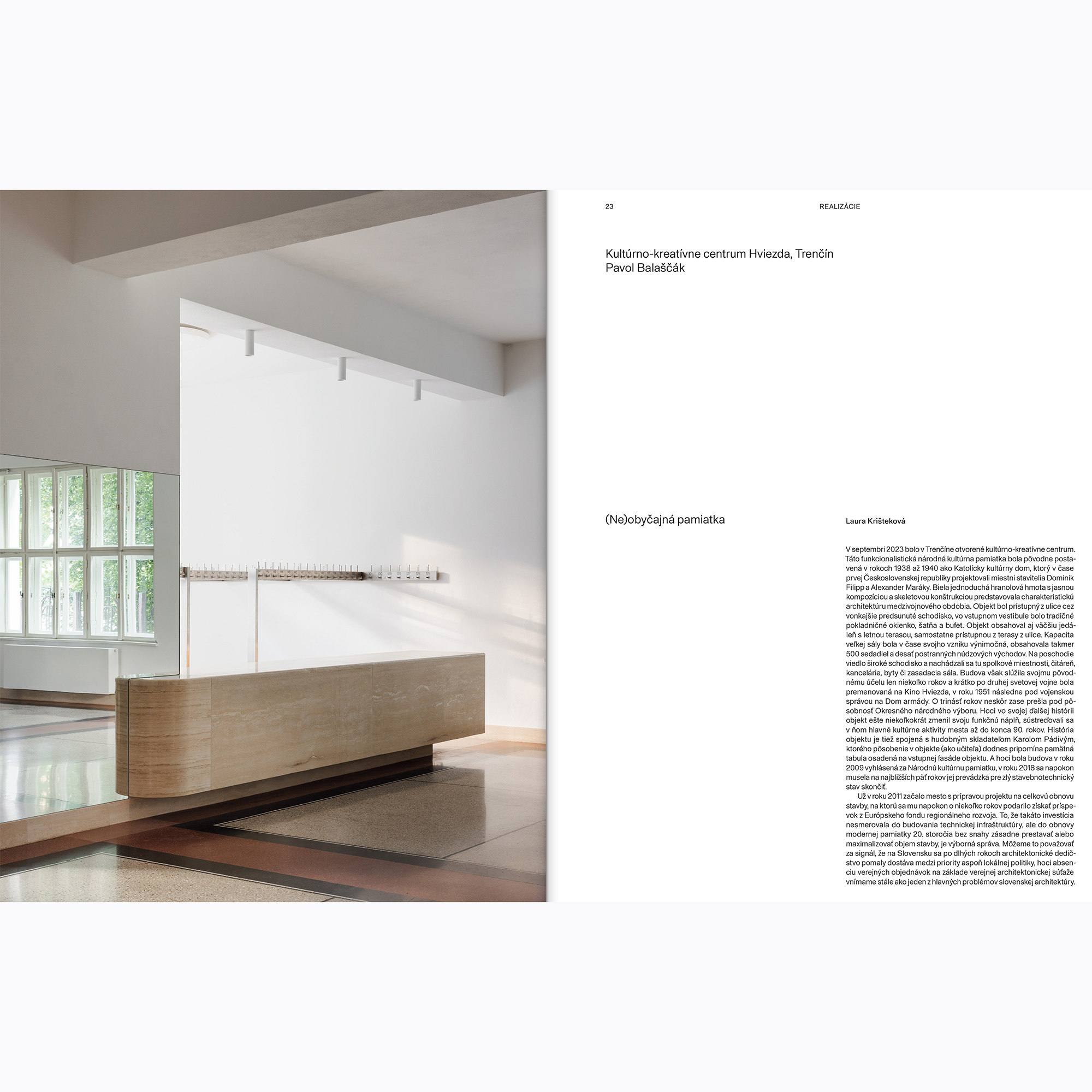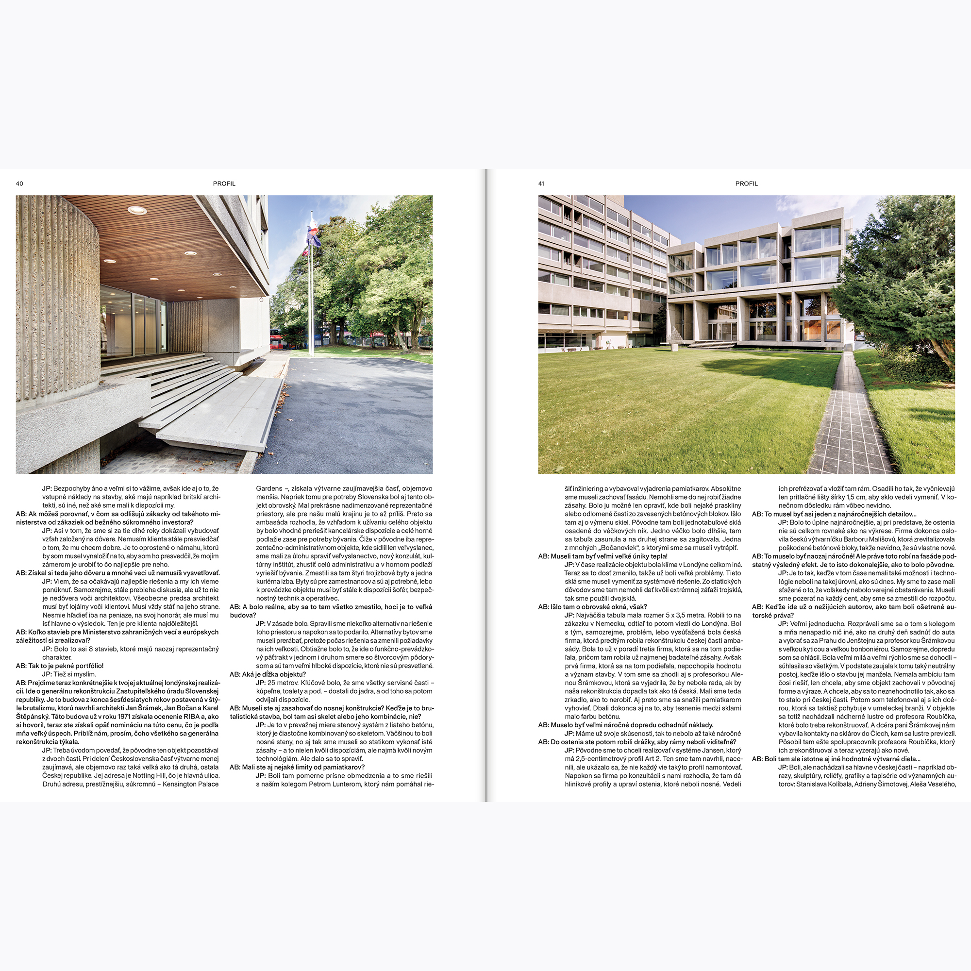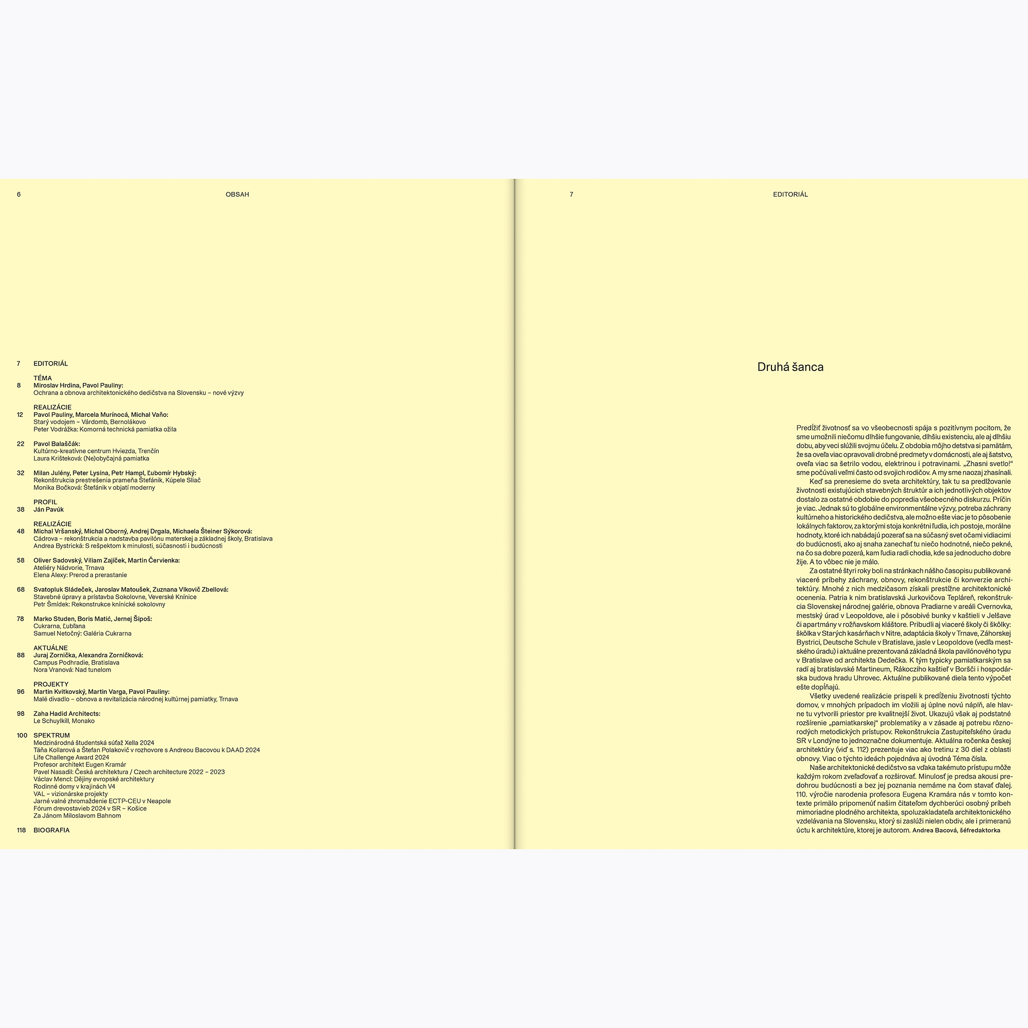 Príčin je viac. Jednak sú to globálne environmentálne výzvy, potreba záchrany kultúrneho a historického dedičstva, ale možno ešte viac je to pôsobenie lokálnych faktorov, za ktorými stoja konkrétni ľudia, ich postoje, morálne hodnoty, ktoré ich nabádajú pozerať sa na súčasný svet očami vidiacimi do budúcnosti, ako aj snaha zanechať tu niečo hodnotné, niečo pekné, na čo sa dobre pozerá, kam ľudia radi chodia, kde sa jednoducho dobre žije. A to vôbec nie je málo. Časopis ponúka cez recenzovanú architektúru bližší pohľad na aktuálne domáce i zahraničné realizácie z tejto oblasti. V rubrike TÉMA sa o metodickom prístupe k obnove dozviete viac. Okrem toho tu nájdete bohaté spektrum informácií o nových, ešte len pripravovaných projektoch, súťažiach, architektonických udalostiach i recenzie nových kníh.