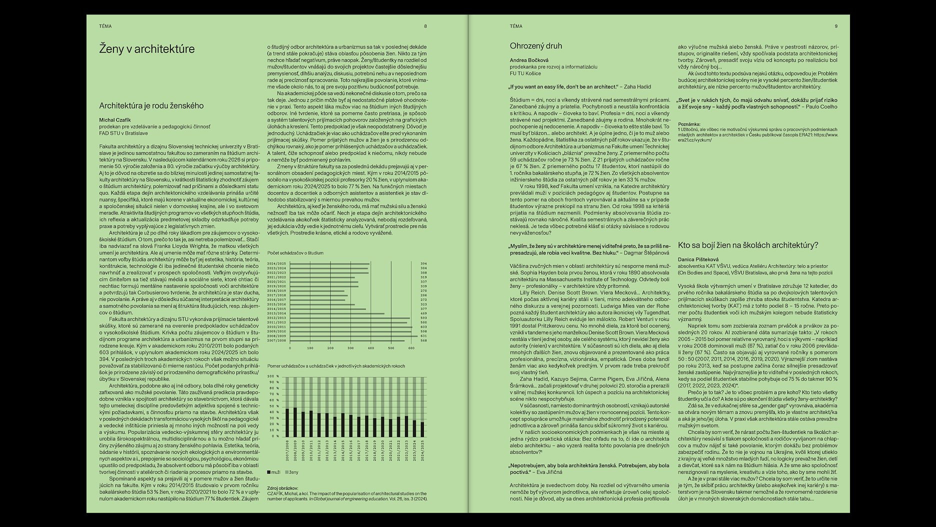 Okrem toho PROJEKT 03/2025 otvára i aktuálnu tému pribúdajúcich žien v architektonickej profesii. Nie však ako popularizovanú gender problematiku, ale jednoducho ako fakt podložený štatistikou enormne pribúdajúcich študentiek na slovenských architektonických fakultách a školách s týmto zameraním. Je už len otázkou času, kedy sa to prejaví i v praxi a ženy budú líderkami architektonických kancelárií. Alebo aj nie? Viac o tom nielen v troch úvodných článkoch zástupcu a zástupkýň uvedených škôl, ale i v rozhovore s dvoma skúsenými a úspešnými architektkami Katarínou Viskupičovou a Zuzanou Zacharovou.