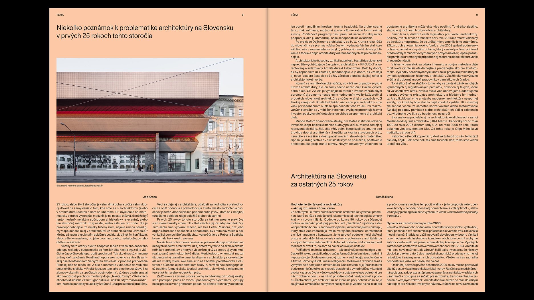 Architektonická scéna na Slovensku zaznamenáva každoročne množstvo prírastkov. Súkromné aj verejné, nové aj obnovené, drobné aj monumentálne. Čo rozhoduje o tom, že sa niektoré dostanú do širokého povedomia a niektoré zostanú naopak nepovšimnuté? Kto a ako rozhoduje o svetle reflektorov, o víťaznom vavríne? Aké sú míľniky v oceňovaní kvalít architektonických diel a čo majú spoločné? Akú rolu v tom hrá verejnosť či sociálne siete?