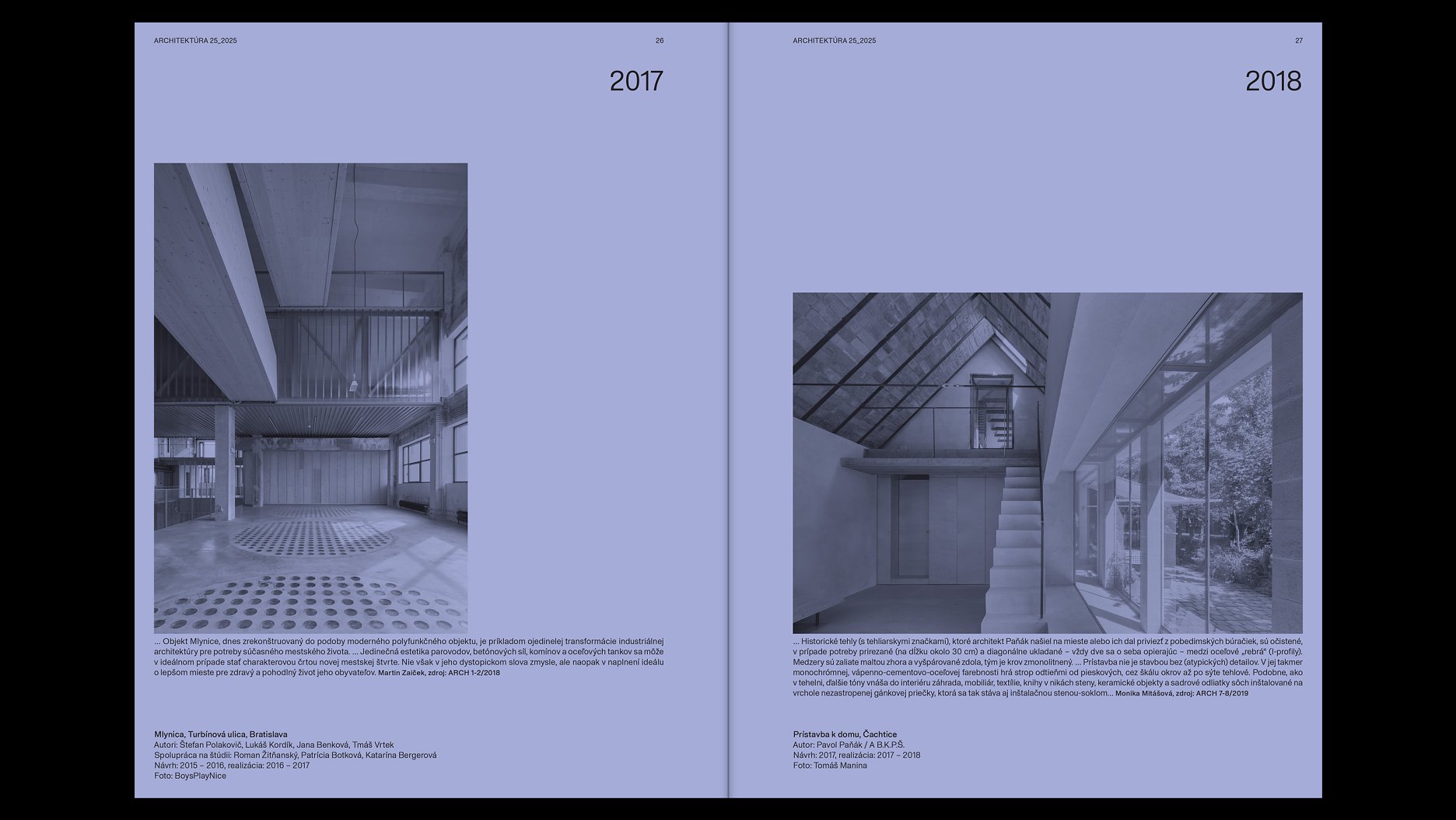 Posledné tohtoročné číslo časopisu PROJEKT sa snaží sumarizovať a zhodnotiť viacero skutočností, ktoré sú pre našu profesiu dôležité. Propagácia kvalitnej architektúry je isto veľmi potrebná a jej spôsob je nutné neustále zlepšovať a hľadať tak nové súvislosti. Tohtoročná prehliadka jesenných architektonických ocenení, ktorú zavŕšili ceny Spolku architektov Slovenska, je zrkadlom kvalitných aktuálnych architektonických diel. Neznamená to však, že nemáme aj iné. Máme, ale nie všetky sa dostanú na stránky časopisov, publikácií alebo do výberu súťažných prehliadok. Ukazuje sa, že medializácia architektúry, hovorenie a písanie o architektúre, je pre jej popularizáciu, ale i následné formovanie všeobecného vkusu verejnosti nesmierne dôležitá. V duchu týchto starých právd PROJEKT 04/2025 prináša niekoľko pohľadov, ale hlavne hodnotení architektúry v kontexte končiaceho sa prvého štvrťstoročia 21. storočia. Ponúka súhrnnú správu o slovenských architektonických oceneniach, ako aj osobnú reflexiu k prvému štvrťstoročiu od niektorých kolegov architektov, na ktoré nadväzuje redakčný výber 25 relevantných architektonických diel z tohto obdobia.