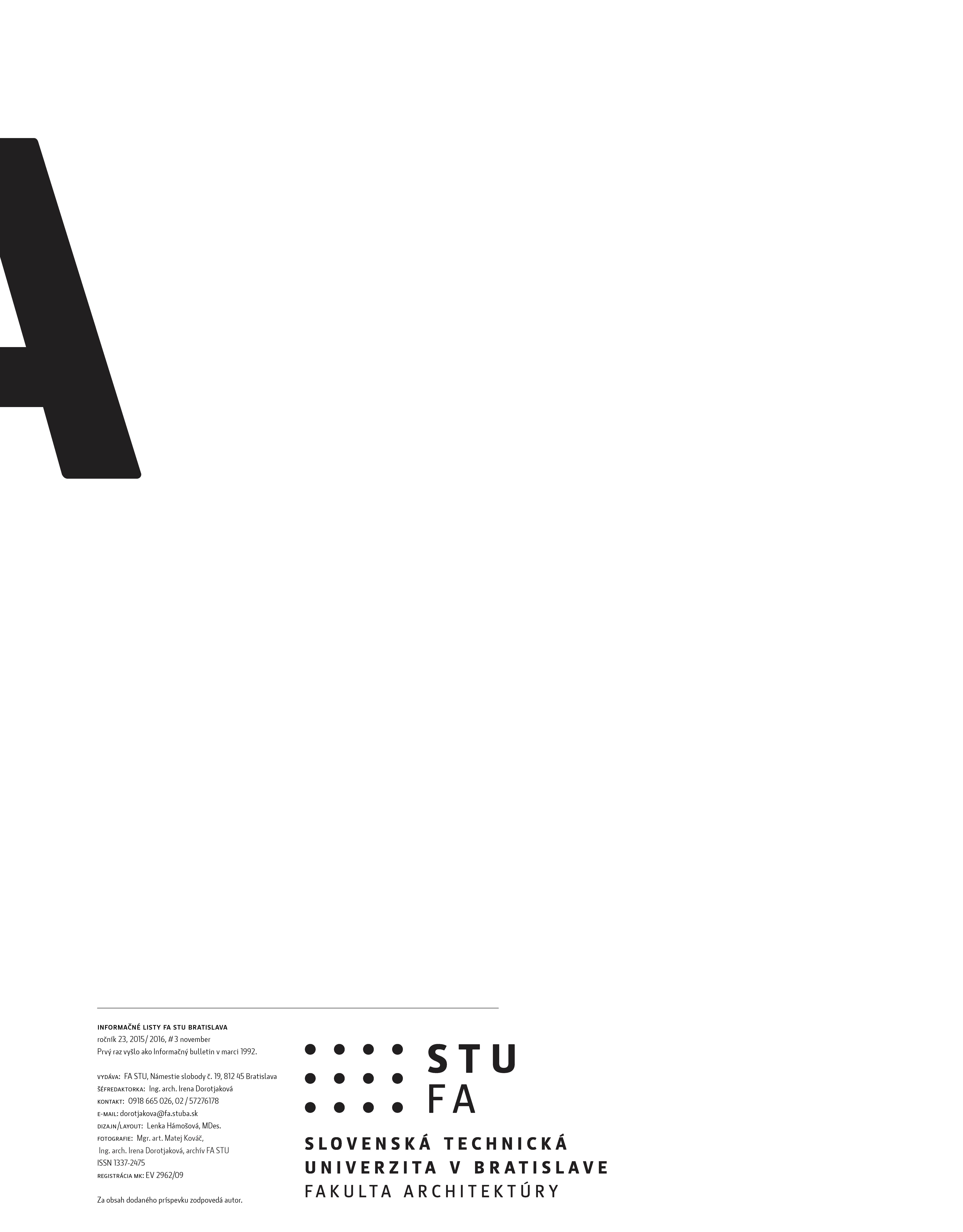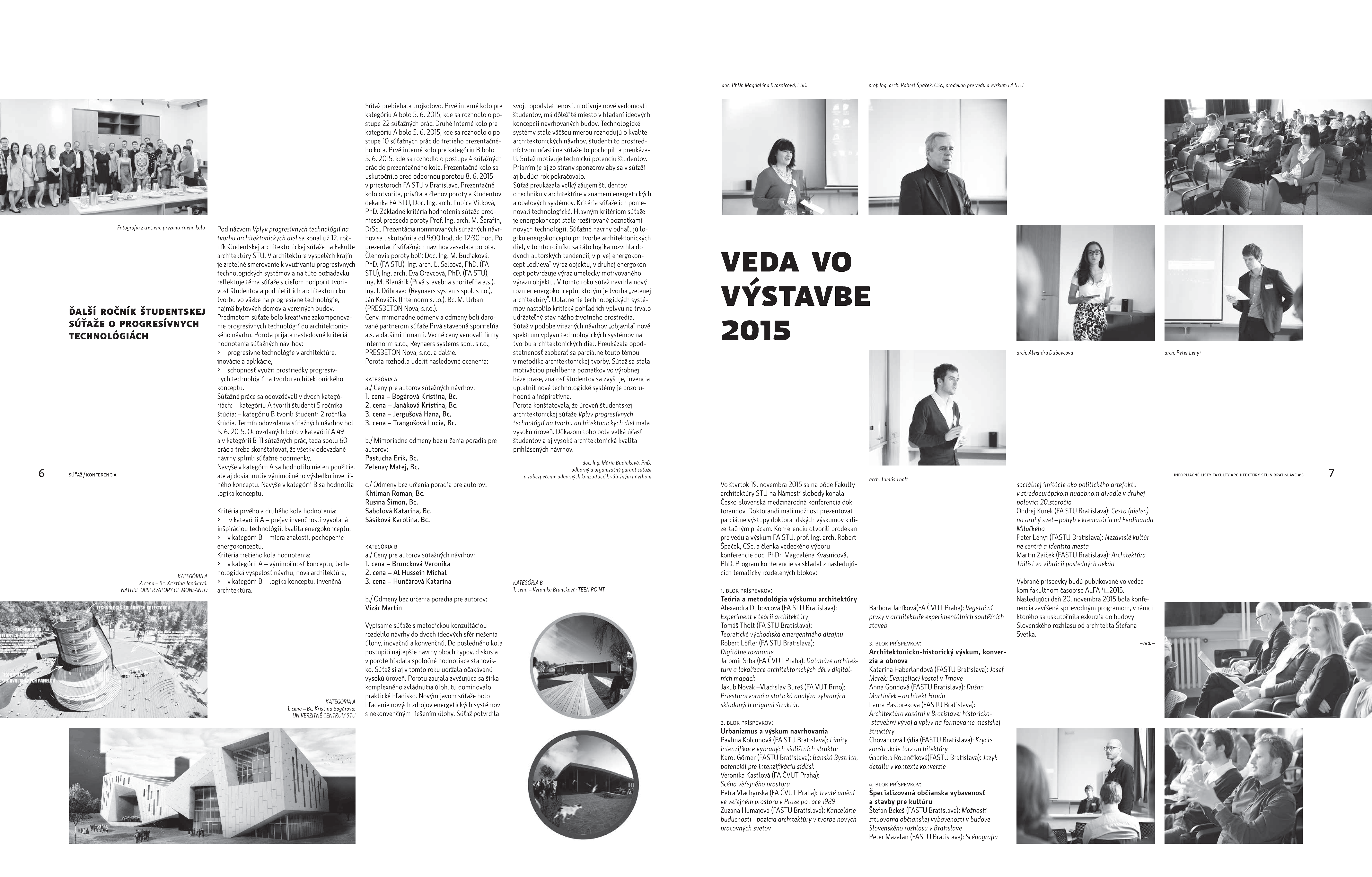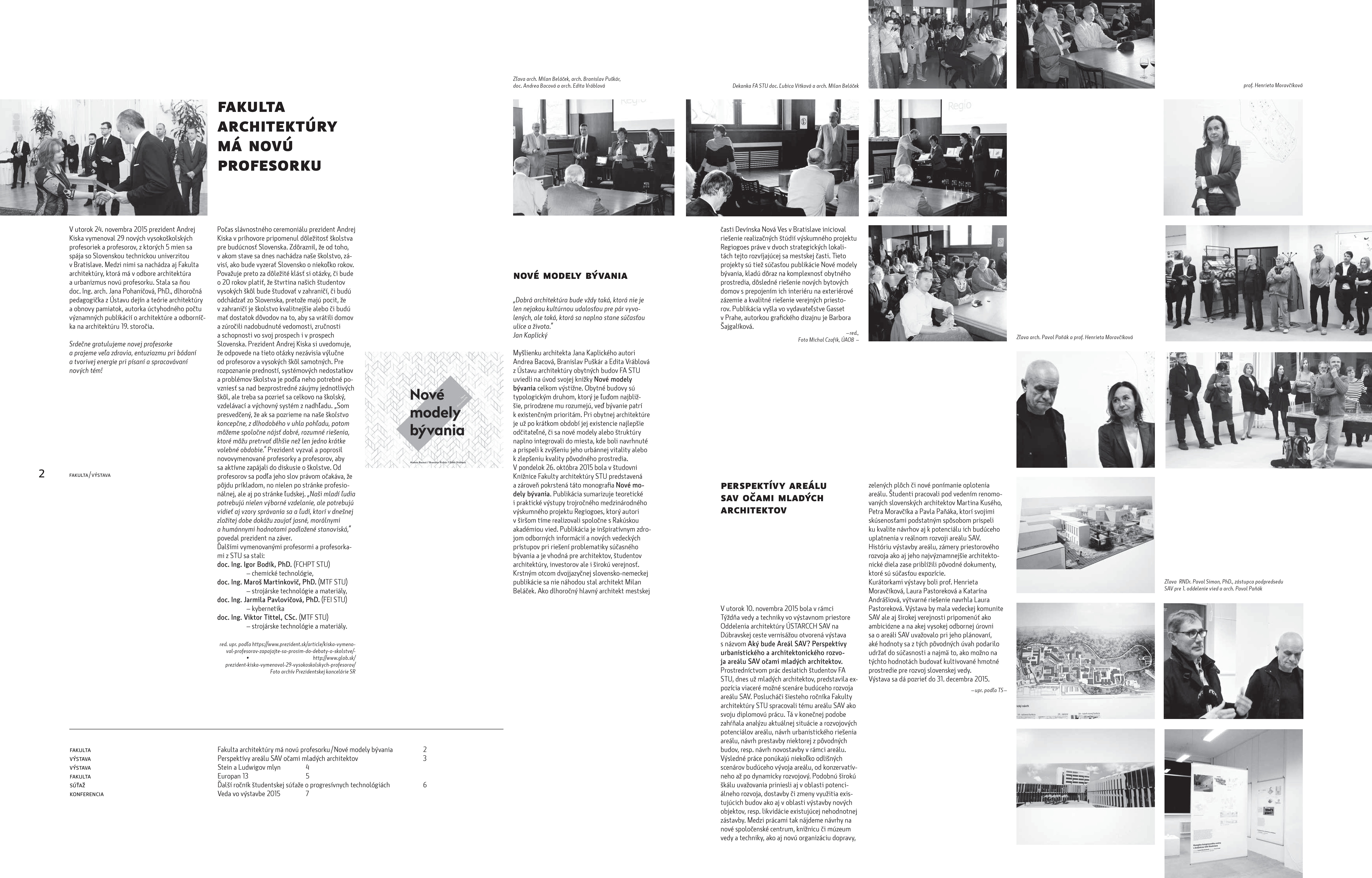 V čísle sú uvedené príspevky: Fakulta architektúry má novú profesorku, o krste novej publikácie Nové modely bývania, o výstave Stein a Ludwigov mlyn, o výstave Aký bude areál SAV, o zastadnutí Europan 2015 Cities and Juries, o ďalšom ročníku študentskej architektonickej súťaže s použitím progresívnych technológií, o doktorandskej konferencii Veda vo výstavbe.