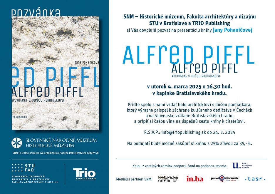 SNM – Historické múzeum, Fakulta architektúry a dizajnu STU v Bratislave a TRIO Publishing si Vás dovoľujú pozvať na prezentáciu knihy Jany Pohaničovej - Alfred Piffl, architekt s dušou pamiatkara utorok 4. marca 2025 o 16.30 hod. v kaplnke Bratislavského hradu.
