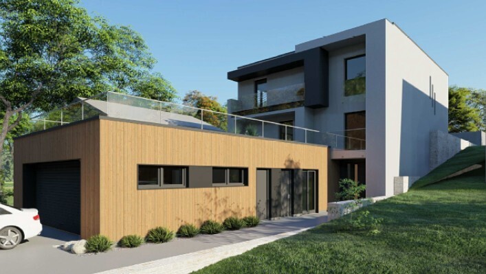 Novotvar v prostredí alpskej obce.