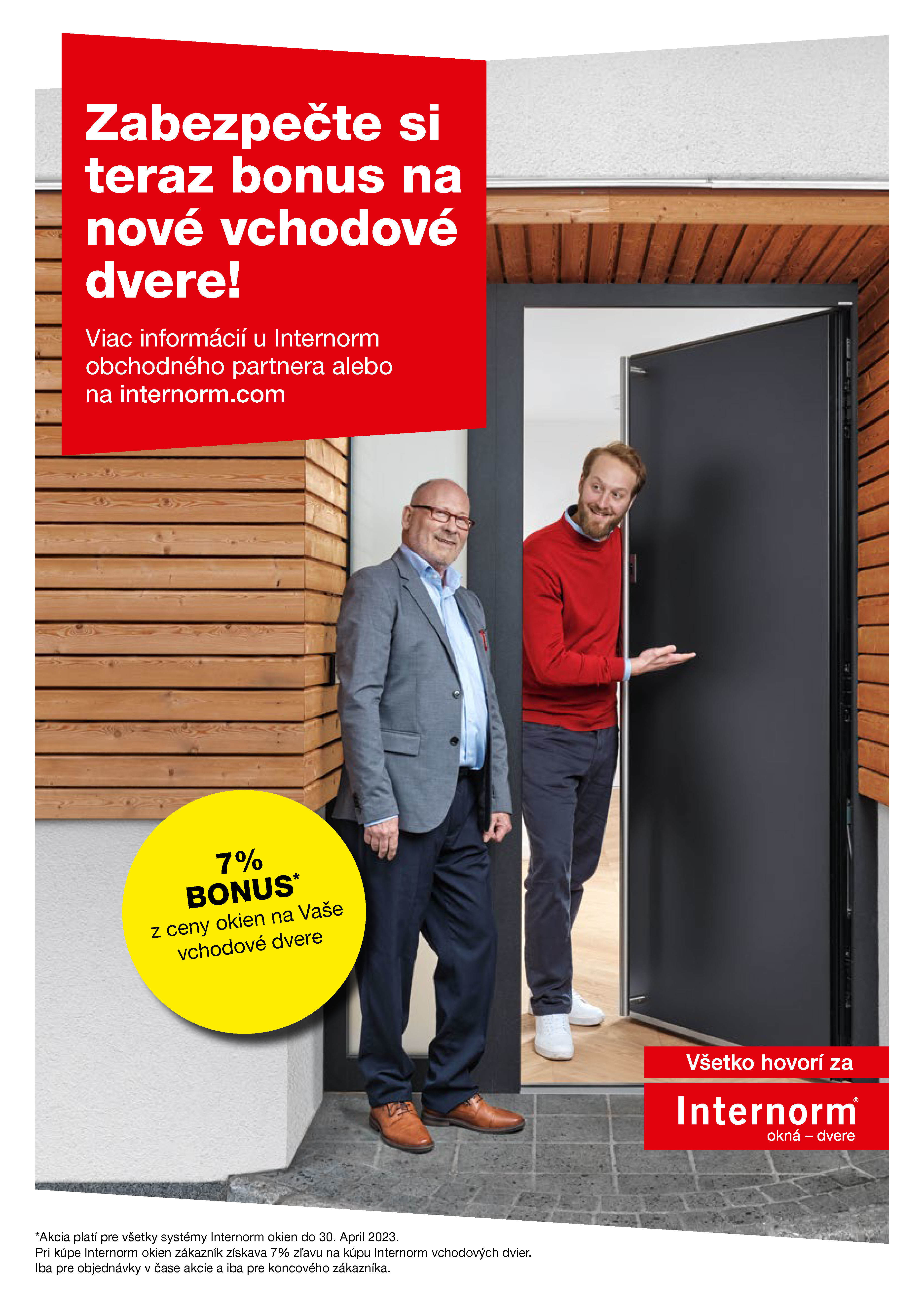 Iba teraz môžete získať skvelý bonus na vchodové dvere od spoločnosti Internorm. Ak si kúpite ľubovolné Internorm okná, automaticky získavate bonus v hodnote 7% na kúpu vchodových dverí.