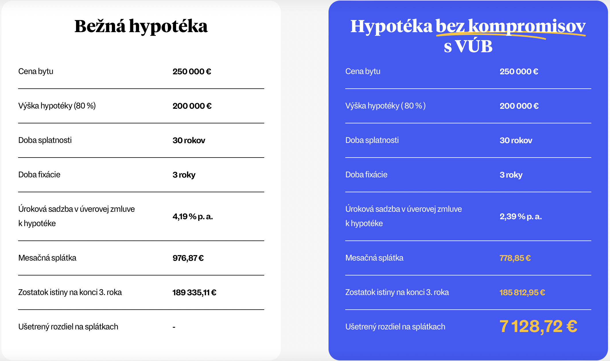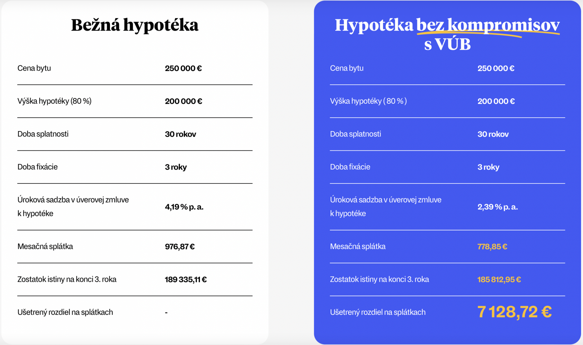 „VÚB bola prvá banka na Slovensku, ktorá pred 26 rokmi začala poskytovať hypotekárne úvery. Umožňuje získať stabilné financovanie na vlastné bývanie čo najširšej skupine klientov a zároveň sa im snaží ponúknuť čo najlepšie podmienky. Avšak aj pri hypotékach sa snažíme neustále prinášať inovácie či novinky a toto je jedna z nich. Vďaka tejto ponuke sa môžu ľudia dostať k bývaniu ešte o niečo výhodnejšie. Stále však platí, že poskytnutie úveru podlieha schváleniu zo strany banky a závisí aj od posúdenia schopnosti žiadateľov splácať tento úver,“ uviedol Michal Vérffy, vedúci oddelenia Obchodné plánovanie a cenotvorba vo VÚB banke.