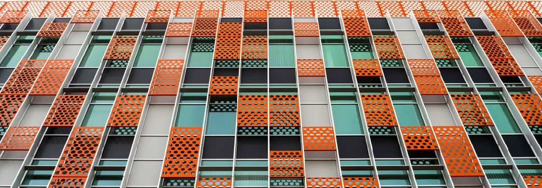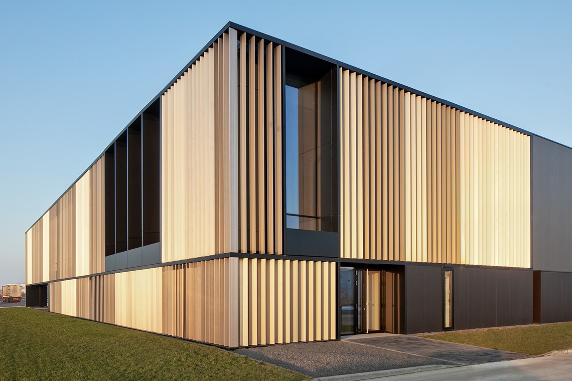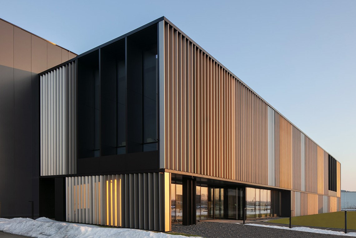 Dvojitý plášť z hliníkových profilov ponúka dynamické vnímanie a rôznorodosť fasády iba s použitím jednej farby, ktorá sa pozorovateľovi zobrazuje rôzne v závislosti od stupňa sklonu žalúzií, čím vytvára vizuálny dialóg s používateľom. Na ich upevnenie bolo vyvinuté aj riešenie na mieru, ktoré pozostáva zo 6 mm kruhového uzáveru, ktorý zakrýva okraj žalúzie a uľahčuje upevnenie v polohe 0°, 20° alebo 40°. Tieto kryty sú mechanizované, čo umožňuje nainštalovať žalúzie v uvedených uhloch a zároveň sa vyhnúť vŕtaniu spodnej časti na mieste, aby sa mohli upevniť na nosné oceľové nosníky, ktoré boli obložené čiernym kompozitným panelom, simulujúcim veľké horizontálne žalúzie, ktoré prechádzajú budovou.