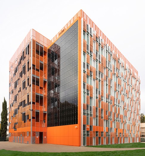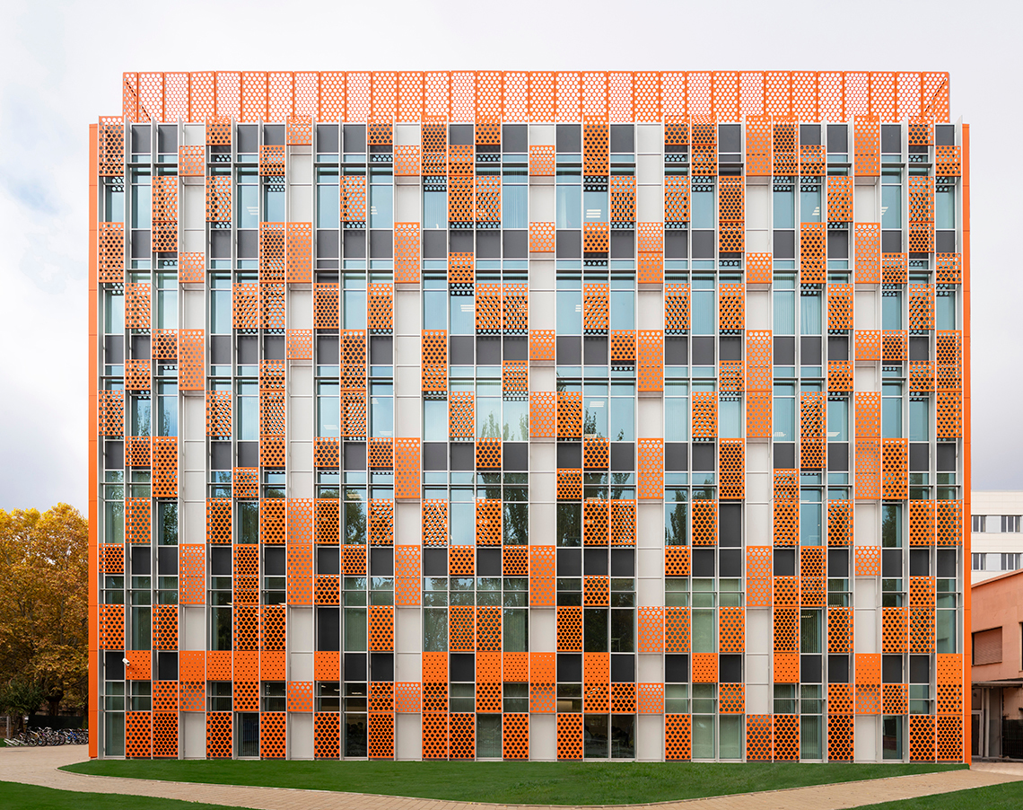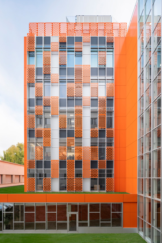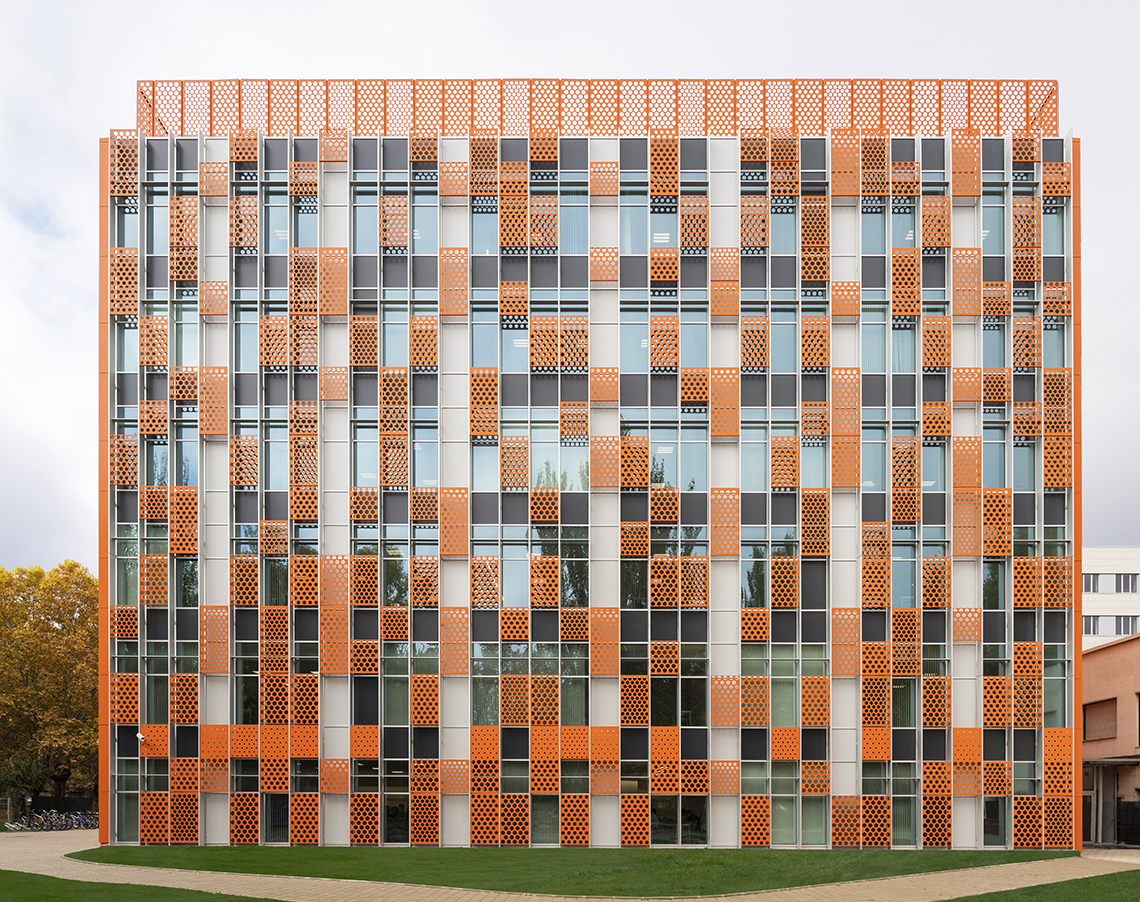 Fasády sú zároveň chránené pred priamym žiarením konštrukciou kolmých rebier, ktoré podopierajú mriežky vyrobené z vysekávaných kompozitných panelov CORTIZO, ktoré poskytujú optimálne tienenie. Ide o efektívne, estetické a trvalo udržateľné konštrukčné riešenie na zakrytie obvodových plášťov budov, ktoré sa skladá z dvoch hliníkových plechov lakovaných na vonkajšej strane oranžovou farbou PVDF 70/30 a ochranným náterom vo vnútri, so stredovým jadrom z minerálnej zmesi a polyetylénu s hrúbkou 3 mm. V tomto prípade sa kompozitný panel použil na konfiguráciu mriežok aj na zakrytie fasád v ich nepriehľadných častiach. Keďže severozápadná a juhovýchodná strana budovy je takmer úplne uzavretá, chráni priestory učební a otvára sa len v priestoroch centrálnej chodby, aby poskytla používateľom nielen osvetlenie, ale aj možnosť výhľadu do exteriéru.