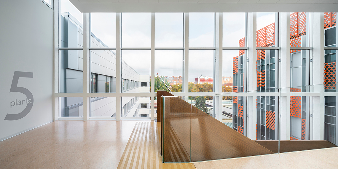 V budove, ktorej základným predpokladom je udržateľnosť, je potrebné, aby k tomuto predpokladu zníženia spotreby energie prispel plášť s vysokou tepelnou účinnosťou. Na fasádach učební (severovýchodná a juhozápadná strana) bolo nainštalovaných viac ako 1 900 m² závesných stien CORTIZO radu TP 52 a TPV 52, tradičného fasádneho alebo tyčového systému zloženého z hliníkových stĺpikov a priečnikov s pohľadovou líniou 52 mm, ktoré tvoria nosnú konštrukciu. Tým sa dosiahol prestup prirodzeného svetla do vnútorných priestorov, pričom sa na šiestich poschodiach budovy vytvorila zasklená plocha od podlahy po strop. V prípade TP 52 je sklo upevnené na všetkých štyroch stranách pomocou priebežného profilu, ktorý je zvonku priskrutkovaný k otvorom pre skrutky zabudovaným v stĺpikoch a priečnikoch.