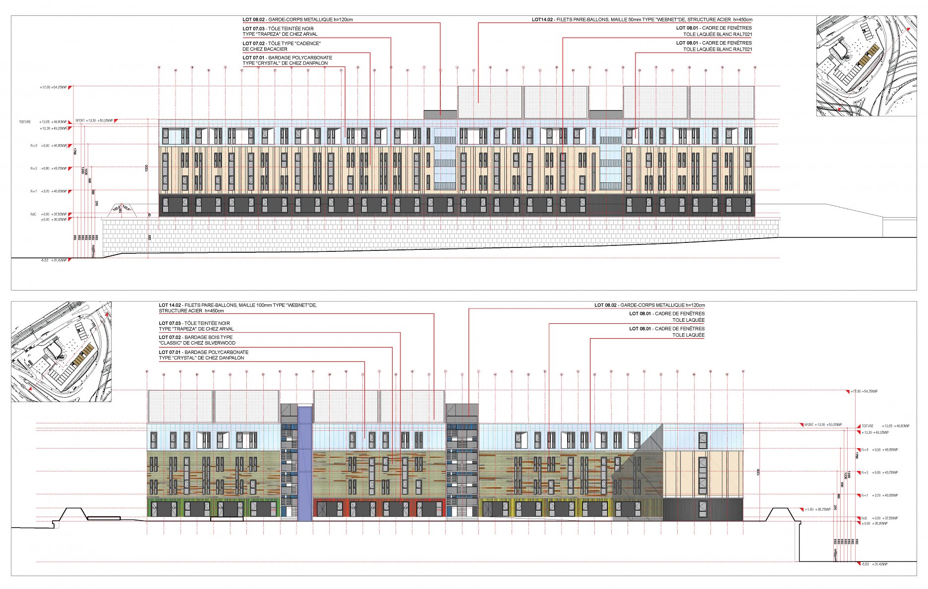 Fasádu tvorí kombinácia rôznych druhov fasádnych obkladov, ktoré vo vzájomne kombinácii pôsobia zaujímavým dizajnovým dojmom. Architekti skombinovali biele polykarbonátové dosky DANPALON s drevenými tepelne ošetrenými palubovkami SILVERWOOD, viacfarebným nepravidelne lakovaným vertikálne zvlneným plechom a nepravidelne zvlneným plechom CADENCE vo farbe slonovej kosti. Fasádu dodala a sesterská organizácia KOMA FACADE patriacia do skupiny KOMA FAMILY.