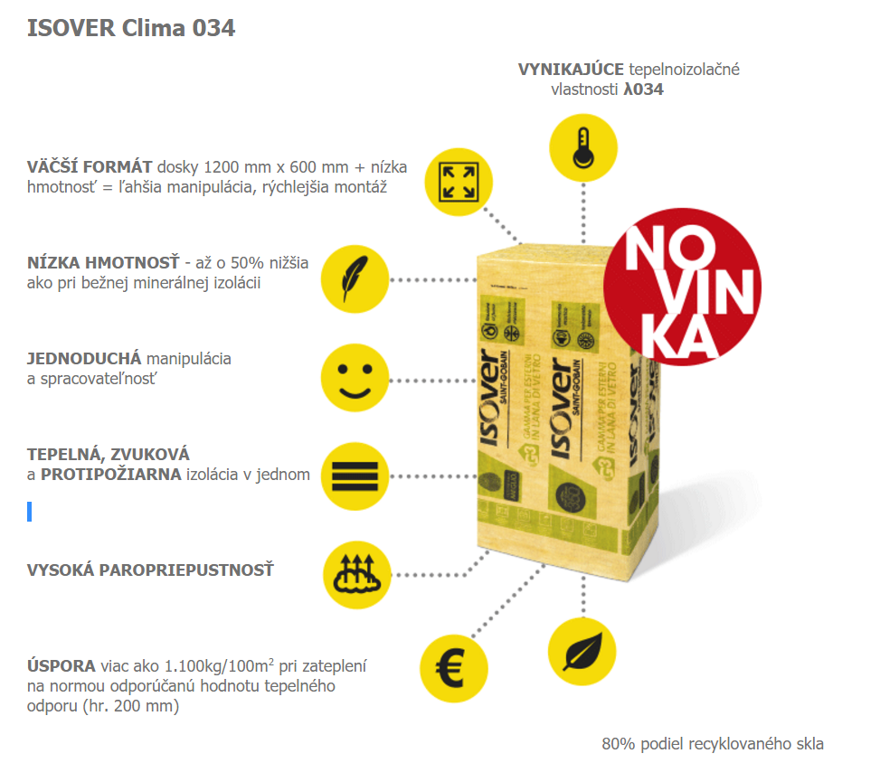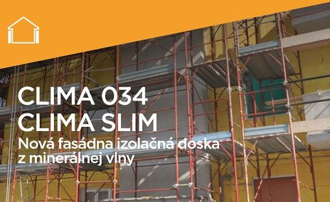 Nový typ izolačnej dosky určenej na kontaktné zateplenie fasád. Ponúka výnimočné tepelnoizolačné vlastnosti v kombinácii s výrazne nižšou hmotnosťou, ktorá je o viac ako 50 % nižšia ako pri bežnej minerálnej izolácii. Ďalšími prednosťami izolácie ISOVER Clima 34 sú zjednodušená manipulácia a aplikácia, vysoká protipožiarna odolnosť, vynikajúce akustické parametre izolácie. Vďaka vysokému podielu recyklovaného skla, až 80 %, je izolácia obzvlášť vhodná pre ekologické stavby.