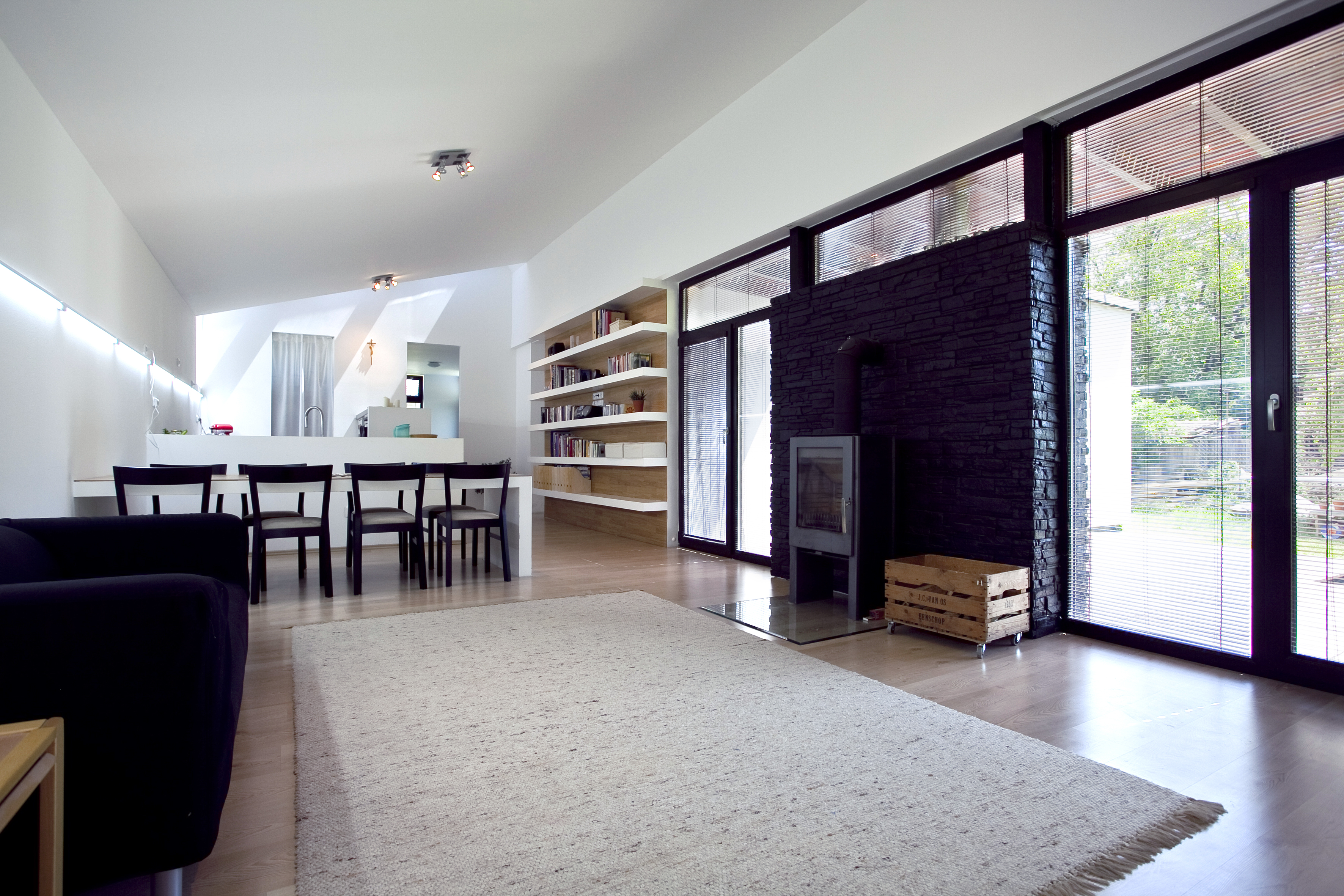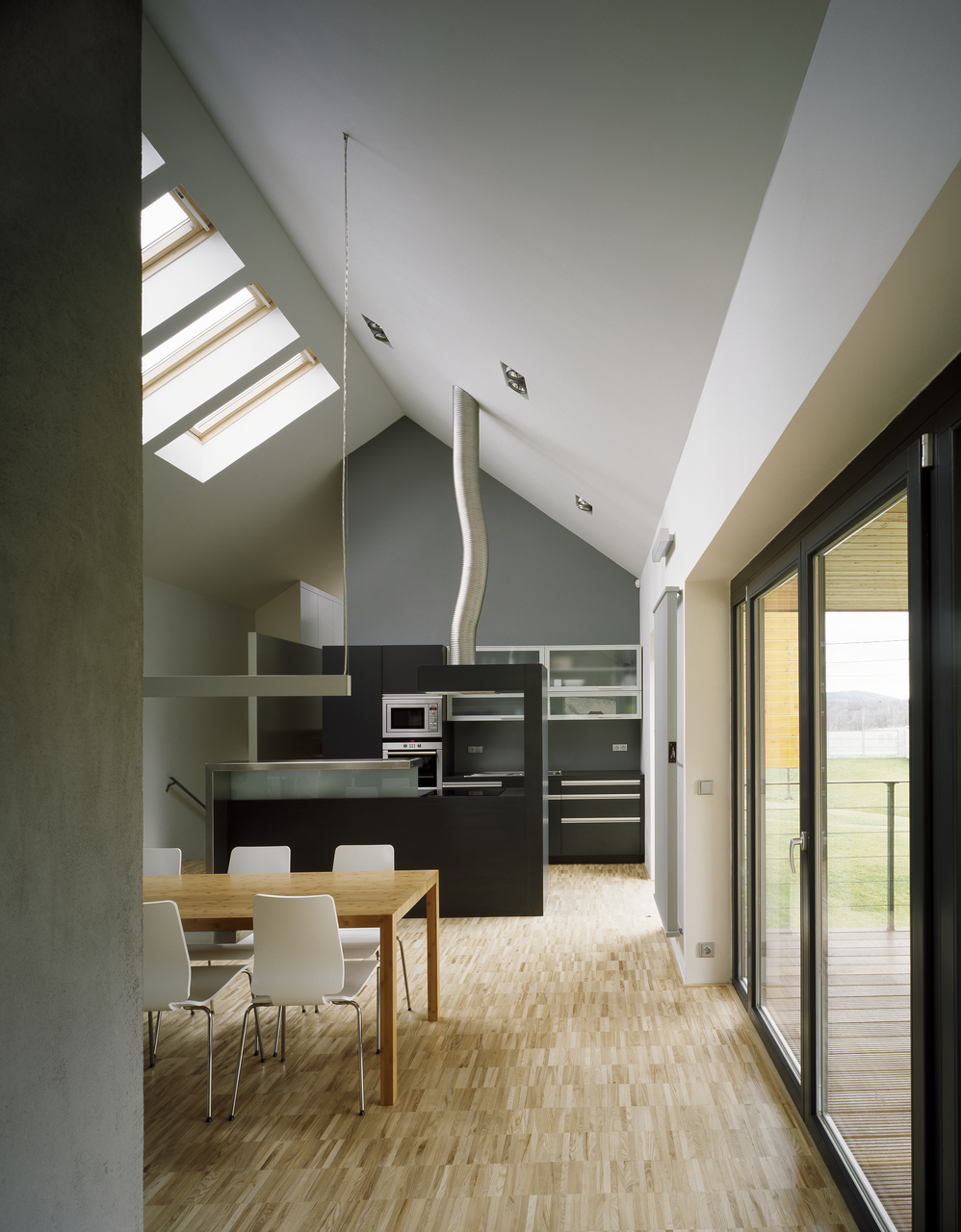 1. Riešenie s otvoreným podhľadom – pri umiestnení 3 kusov strešných okien do otvoreného podhľadu prízemného domu sa nezvýši potreba energie na vykurovanie. Neoprávnenosť tejto častej obavy potvrdila štúdia spoločnosti VELUX. Zároveň však dochádza k znižovaniu spotreby energie na svietenie. Pri orientácii strešných okien na juh, v zime možno profitovať z pasívnych tepelných ziskov. V lete účinne bránia prehrievaniu vonkajšie tieniace prostriedky. Stavba si tak nepretržite udržiava optimálne vnútorné prostredie. Kombináciu strešných a fasádnych okien možno využiť na efektívne vetranie, prostredníctvom tzv. komínového efektu.
