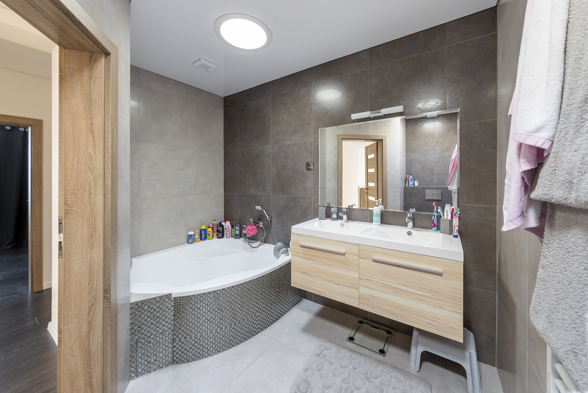 Kúpeľňa bola ďalším tmavým kútom, ktorý si priam žiadal oživiť denným svetlom. Majiteľ sa rozhodol osadiť dva svetlovody, ktoré priestor príjemne presvetlili. Pomáhajú tiež šetriť energiu, keďže cez deň netreba toľko svietiť umelým svetlom.