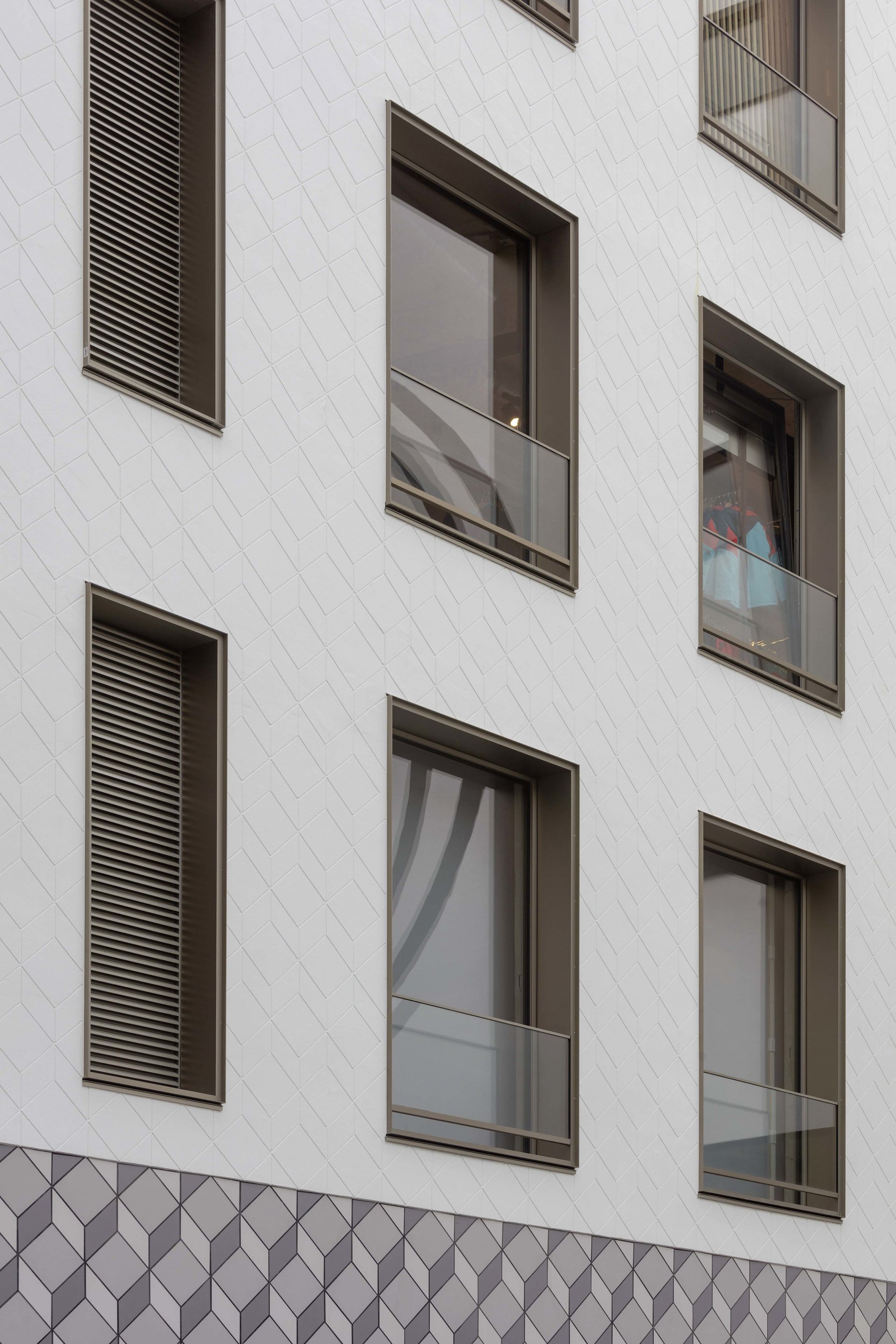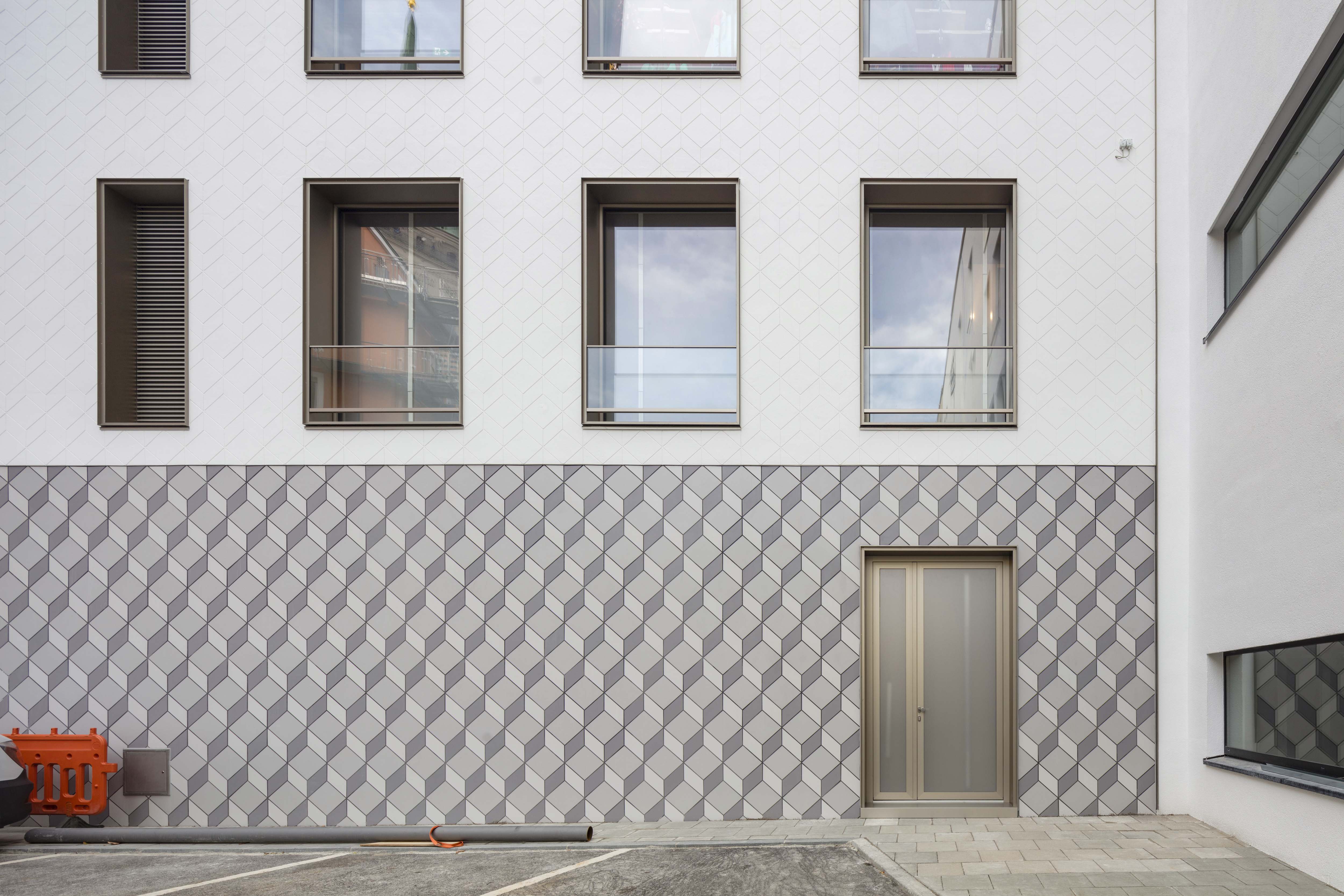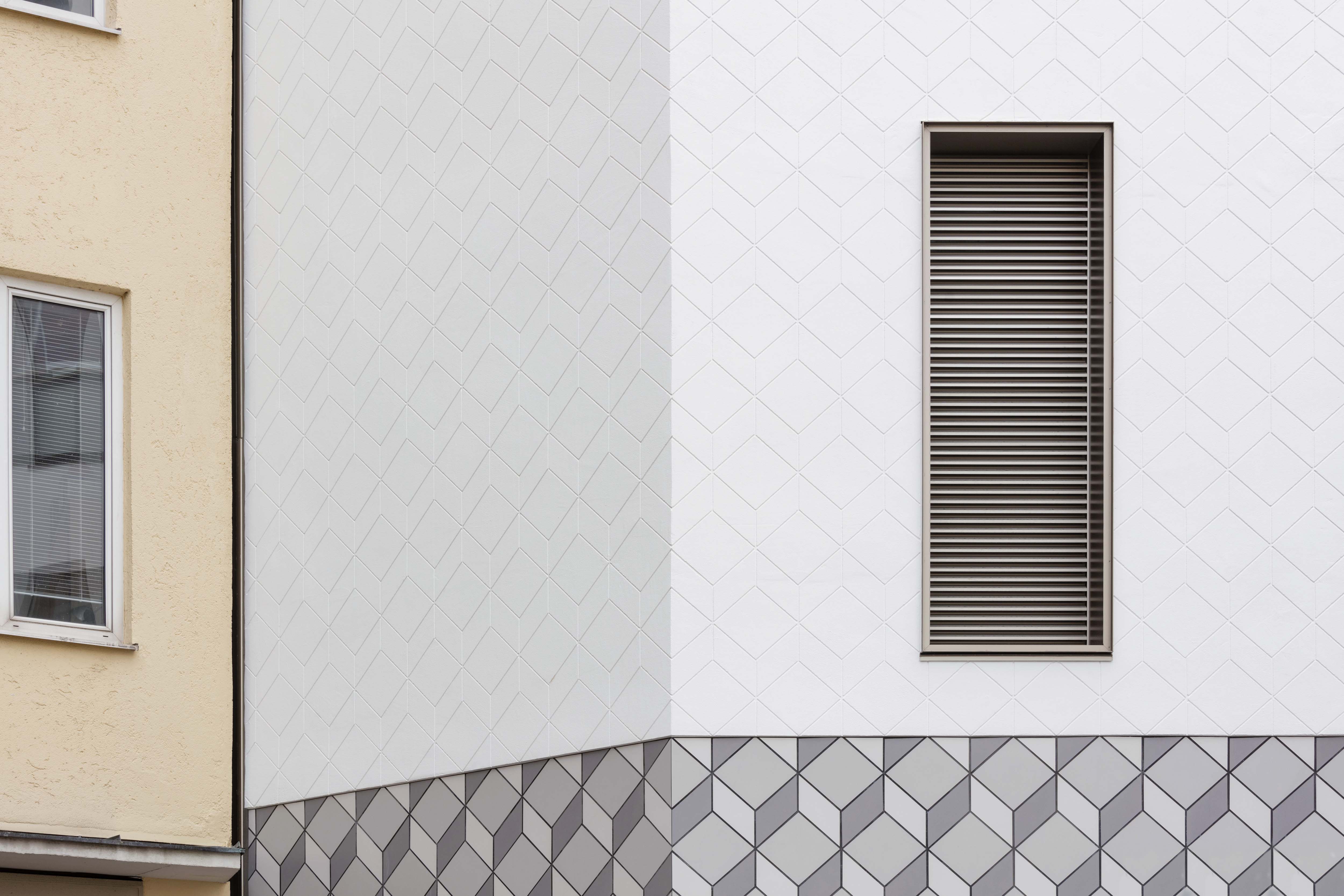 Tie tvoria geometrický vzor s trojrozmerným efektom a na strane do ulice blokovej zástavby pokrývajú celú fasádu. Na strane do dvora chránia iba prízemie, nad ním však pokračuje bohatá geometria na upravenej omietkovej fasáde. Architekti vsadili v tomto prípade na súhru perspektívy a vnímania, ktorá priestorovosť iba predstiera. Zdobené obklady oživujú fasádu a súčasne zvyšujú jej hodnotu.