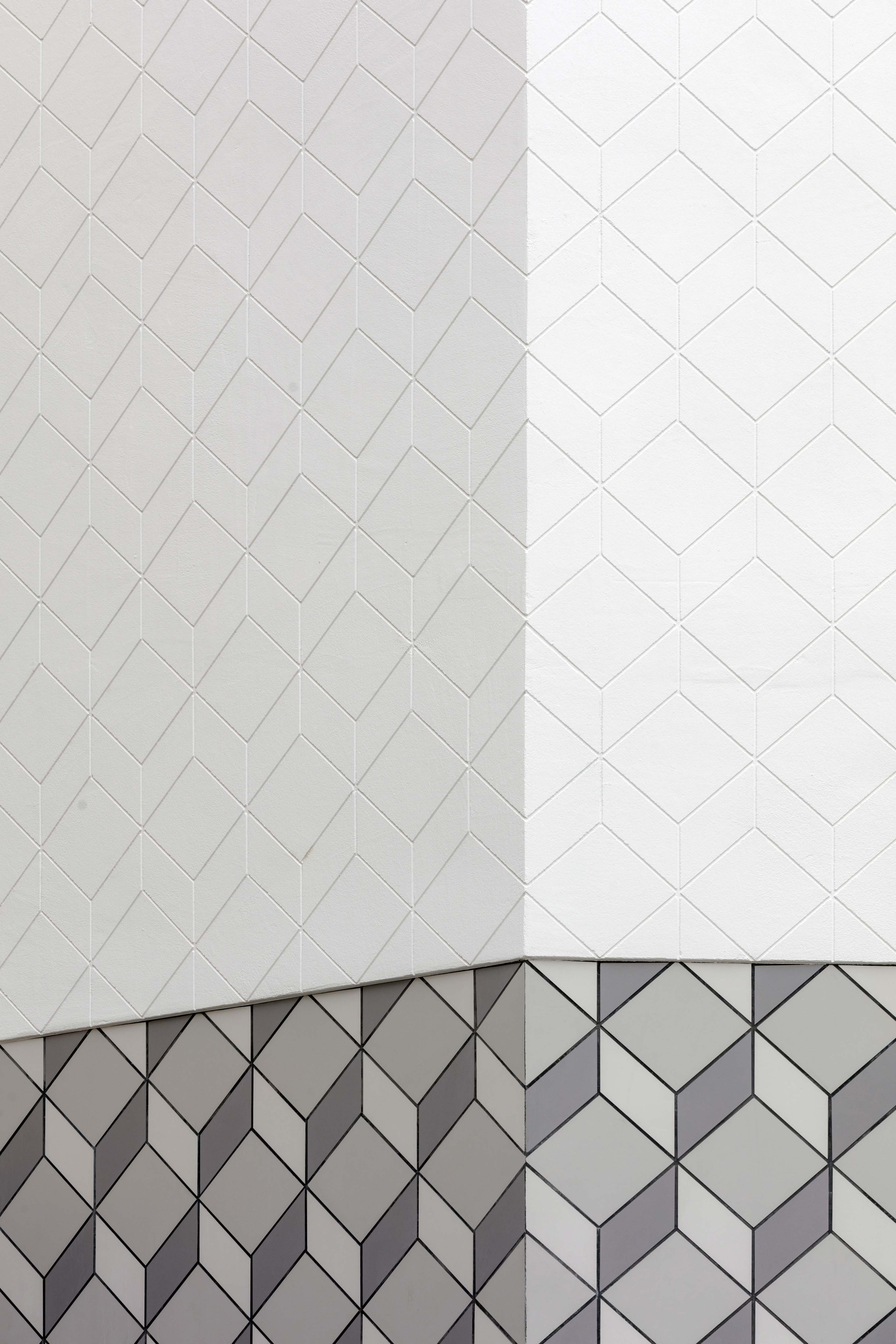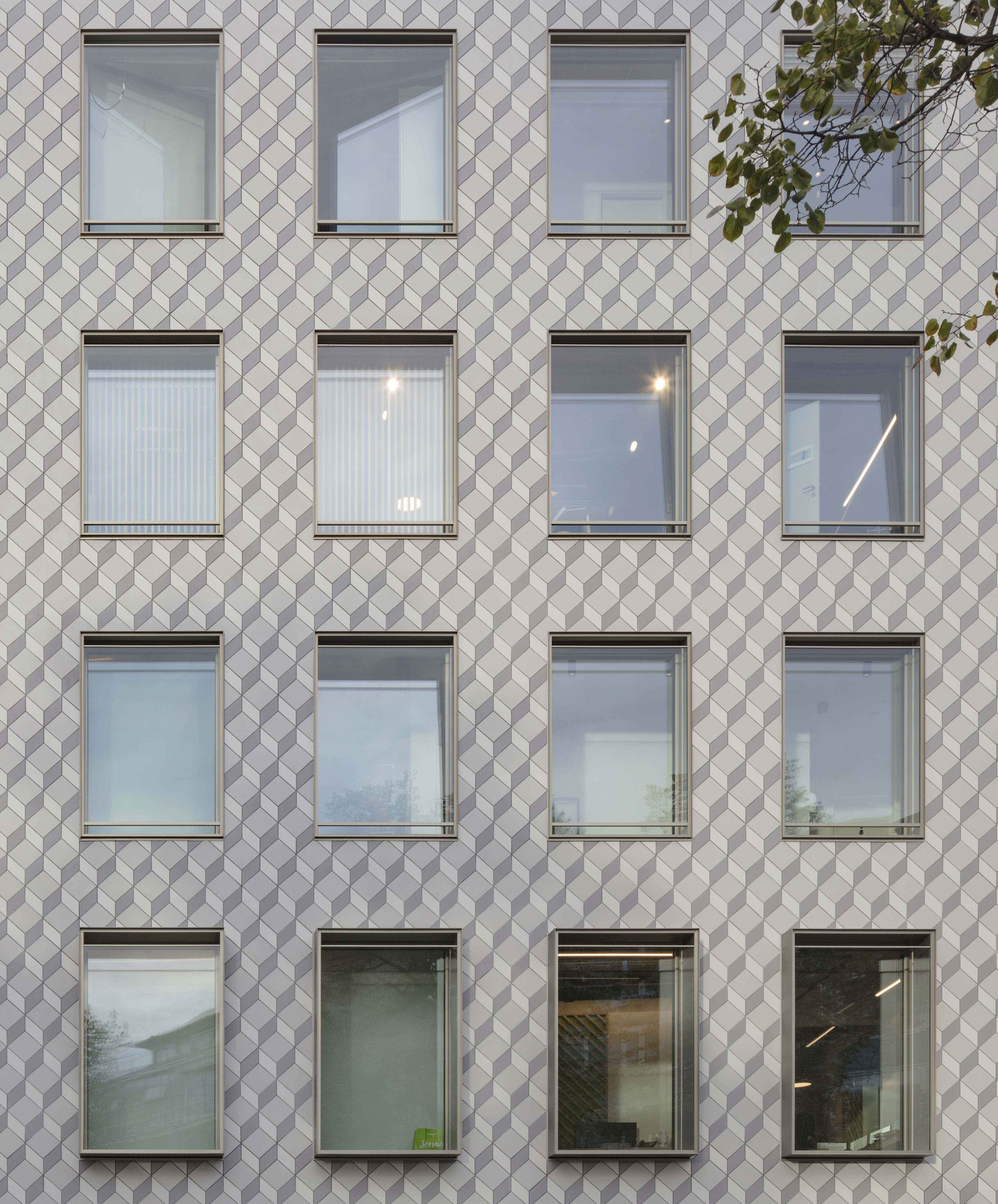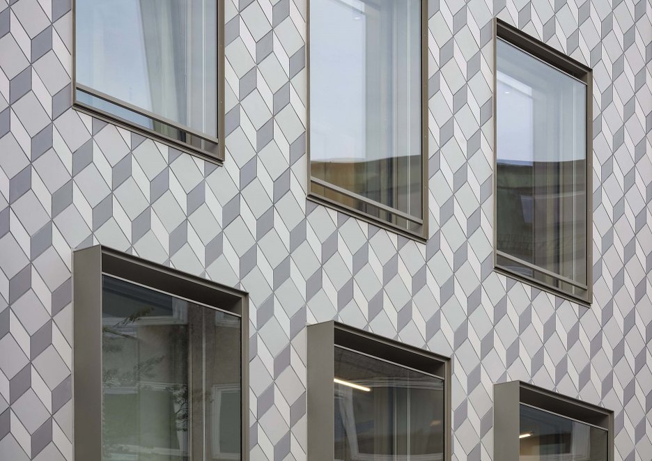 Tie tvoria geometrický vzor s trojrozmerným efektom a na strane do ulice blokovej zástavby pokrývajú celú fasádu. Na strane do dvora chránia iba prízemie, nad ním však pokračuje bohatá geometria na upravenej omietkovej fasáde. Architekti vsadili v tomto prípade na súhru perspektívy a vnímania, ktorá priestorovosť iba predstiera. Zdobené obklady oživujú fasádu a súčasne zvyšujú jej hodnotu.