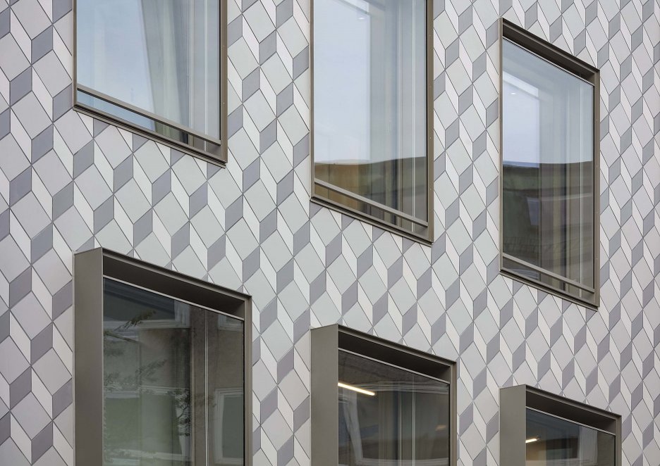 Kompetencie Sto: Minerálny fasádny zatepľovací systém StoTherm Mineral s keramickými obkladmi a omietkou StoSignature Graphic (dve vrstvy vrchnej omietky StoMiral Nivelle FF s jemnou štruktúrou, filcovaná, frézovaná)