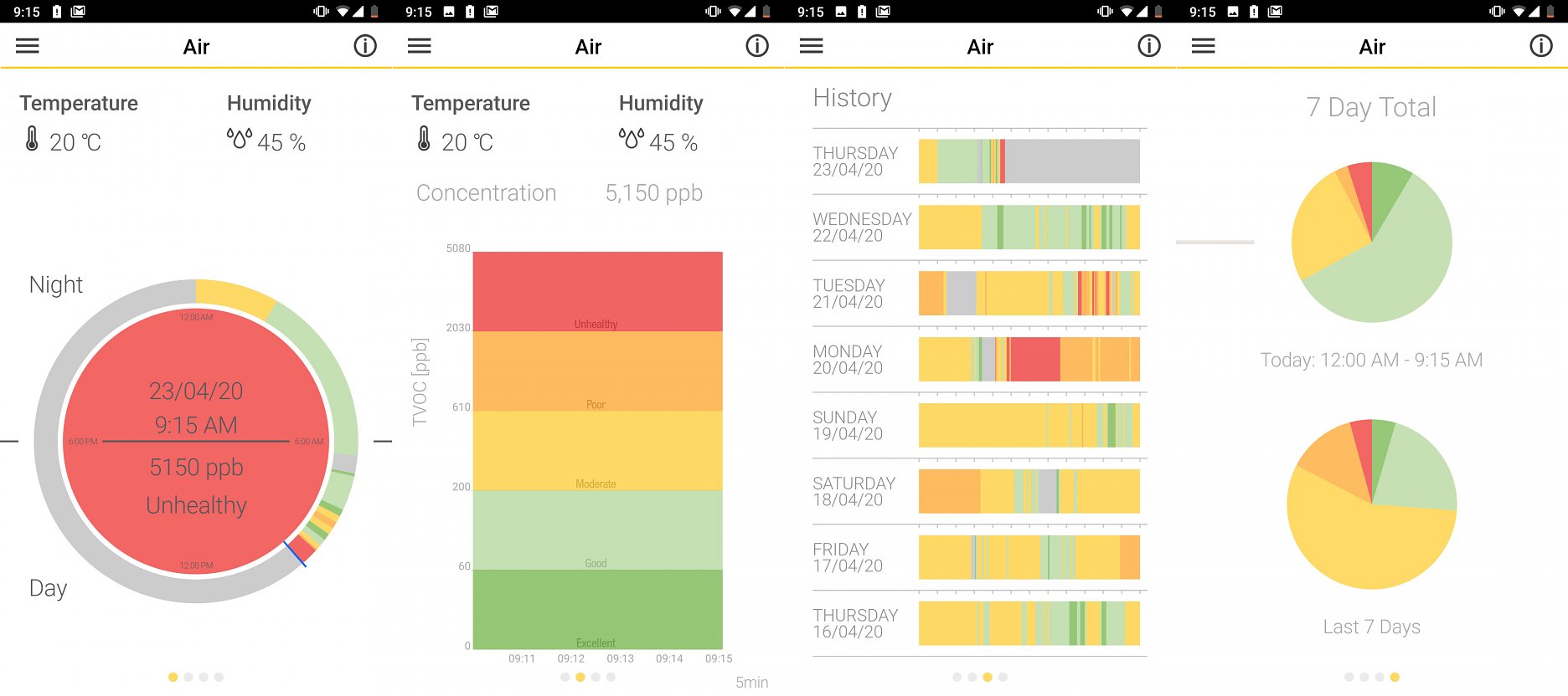 Poslednou “stavbárskou” funkciou, ktorou CAT disponuje je meranie kvality ovzdušia. Senzor na bočnej hrane smartfónu sníma koncentráciu VOC (prchavých organických zlúčenín), ale tiež vlhkosť a teplotu okolitého vzduchu. Okrem primárnej funkcie - ochrany zdravia, tak telefón umožňuje sledovať ukazovatele dôležité pre niektoré stavebné procesy. Zaznamenané údaje sa zobrazujú v prehľadnom diagrame (viď. obrázok). Túto funkciu som sledoval asi najmenej, očividne však funguje. Pri práci s čistiacimi prostriedkami, alebo technickým benzínom telefón vždy vo vrecku výstražne zavibroval.