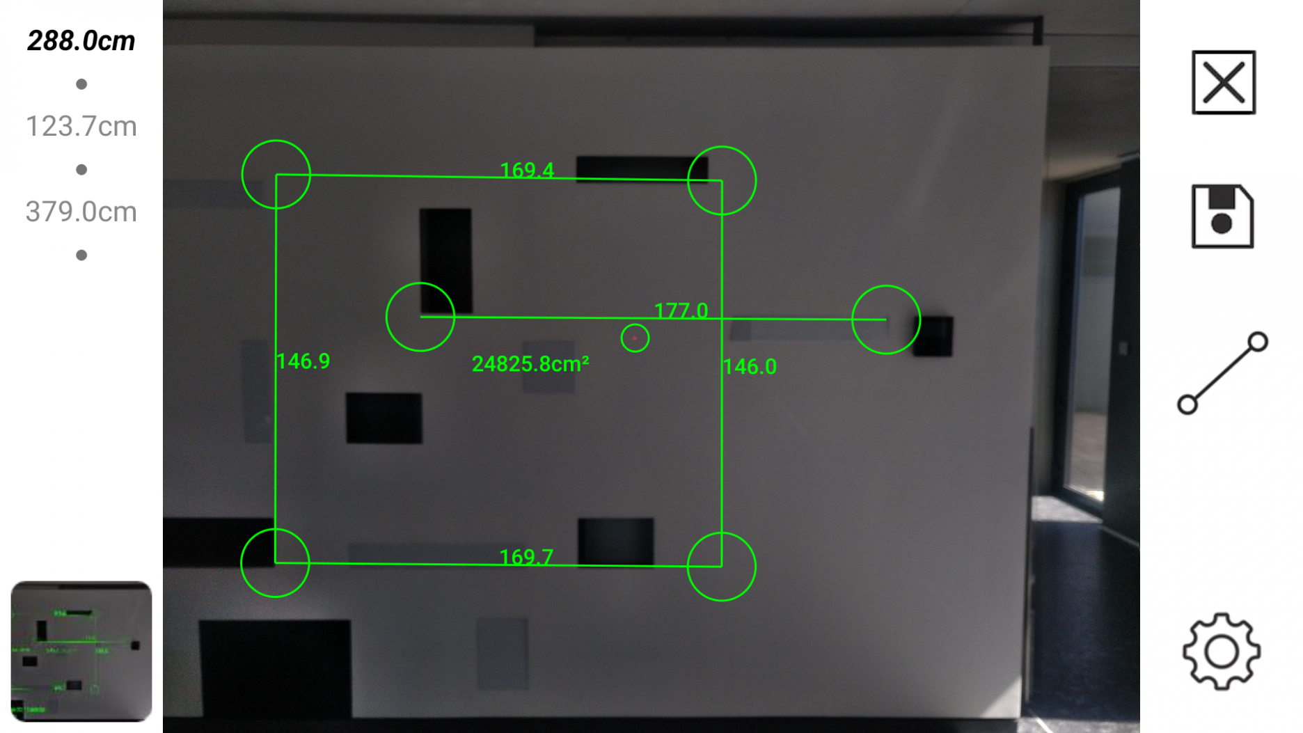 Laserový diaľkomer je ďalšou užitočnou funkciou. Okrem priameho merania vzdialenosti umožňuje aplikácia aj jednoduchý výpočet plochy (viď. fotografia). Obrázok s uloženou meračkou dokáže pohodlne nahradiť klasické “ceruzkové skice”. Treba si však dať pozor na poriadne kalibrovanie laseru, ktoré je treba pravidelne vykonávať. Následne je odchýlka merania v rádoch mm. Po poriadnej kalibrácii som sa nestretol s výraznými nepresnosťami merania, ktoré sa spomínajú vo viacerých recenziách.
