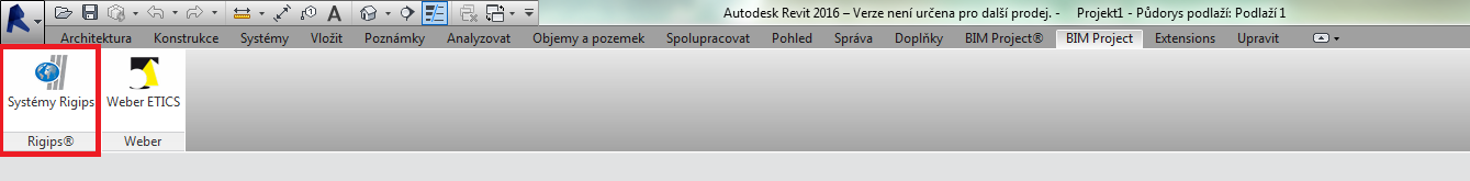 • REVIT - nová záložka „BIM Project“ a v nej sa zobrazí „Systémy Rigips“.