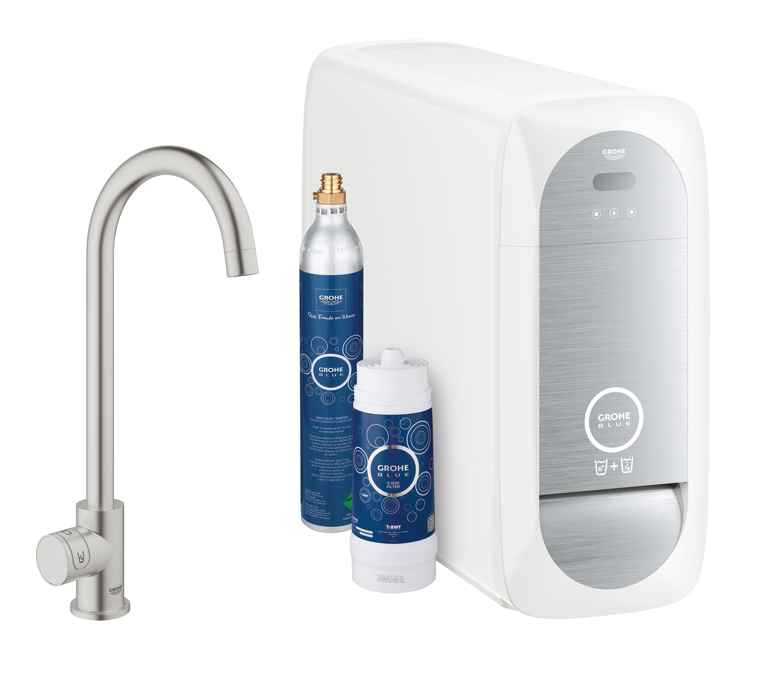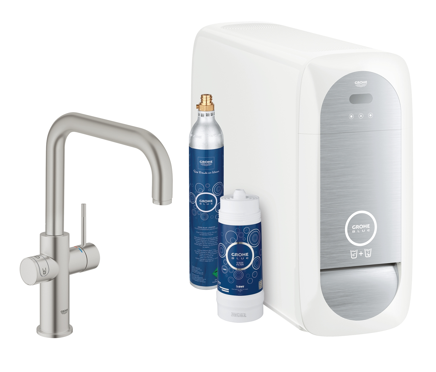 GROHE Blue Home Startovní sada s výpustí ve tvaru L set obsahuje: GROHE Blue Home páková dřezová baterie s filtrační funkcí jednootvorová montáž L-výpusť samostatné ovládání pro filtrovanou a chlazenou stolní vodu neperlivá, jemně perlivá, perlivá GROHE StarLight® povrch keramická kartuše 28 mm s GROHE SilkMove® otočná výpusť otočný úhel 150 ° Oddělené vedení vody flexi připojovací hadičky GROHE Blue Home chladič dodá 3 litrů chlazené vody za hodinu chladící jednotka 180 W, 230 V, 50 Hz typ ochrany IP 21 znak CE nastavitelný pro GROHE Blue filtr velikost S, GROHE Blue aktivní uhlíkový filtr a GROHE Blue magnesium+ filtr GROHE Blue filtr velikost S, hlava filtru s flexibilním nastavením tvrdosti vody GROHE Blue CO2 lahev 425 g