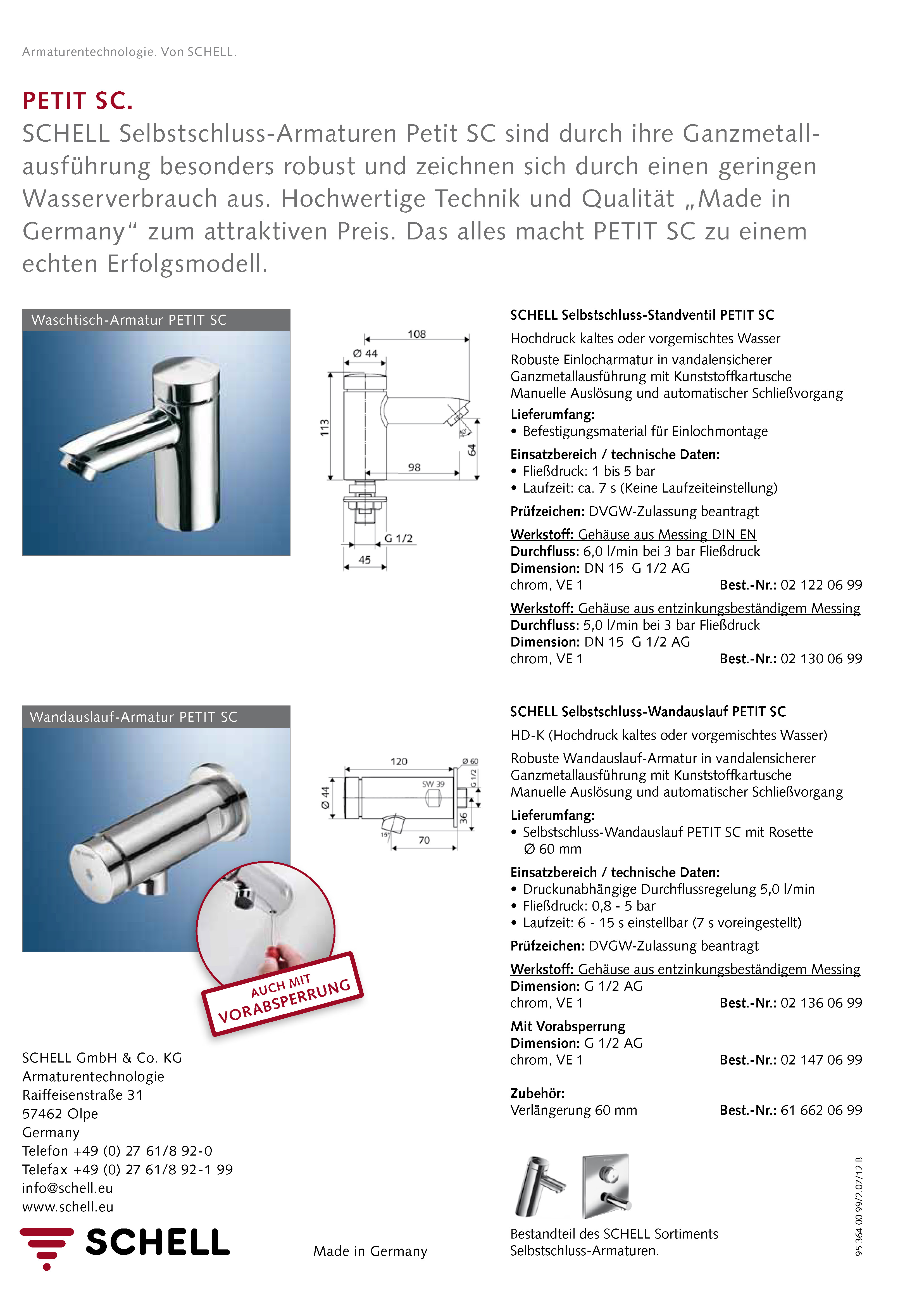 Robustná jednootvorová armatúra Petit SC-M (“self-close-mixer”) v celokovovom vyhotovení s umelohmotnou kartušou a vybavená eco-perlátorom. Disponuje tiež možnosťou nastavenia doby toku, čím výrazne prispieva ku zníženiu spotreby vody. Táto zmiešavacia armatúra s regulátorom teploty sa spúšťa mechanicky a uzatvára sa samočinne. V spojení s jej robustným, vysoko odolným vyhotovením je preto vhodná do veľmi exponovaných verejných priestorov ako sú školy, úrady, športoviská, alebo obchodné centrá. Vhodne tak dopĺňa dnes už bežne používanú verziu armatúry PETIT SC na jednu vodu.