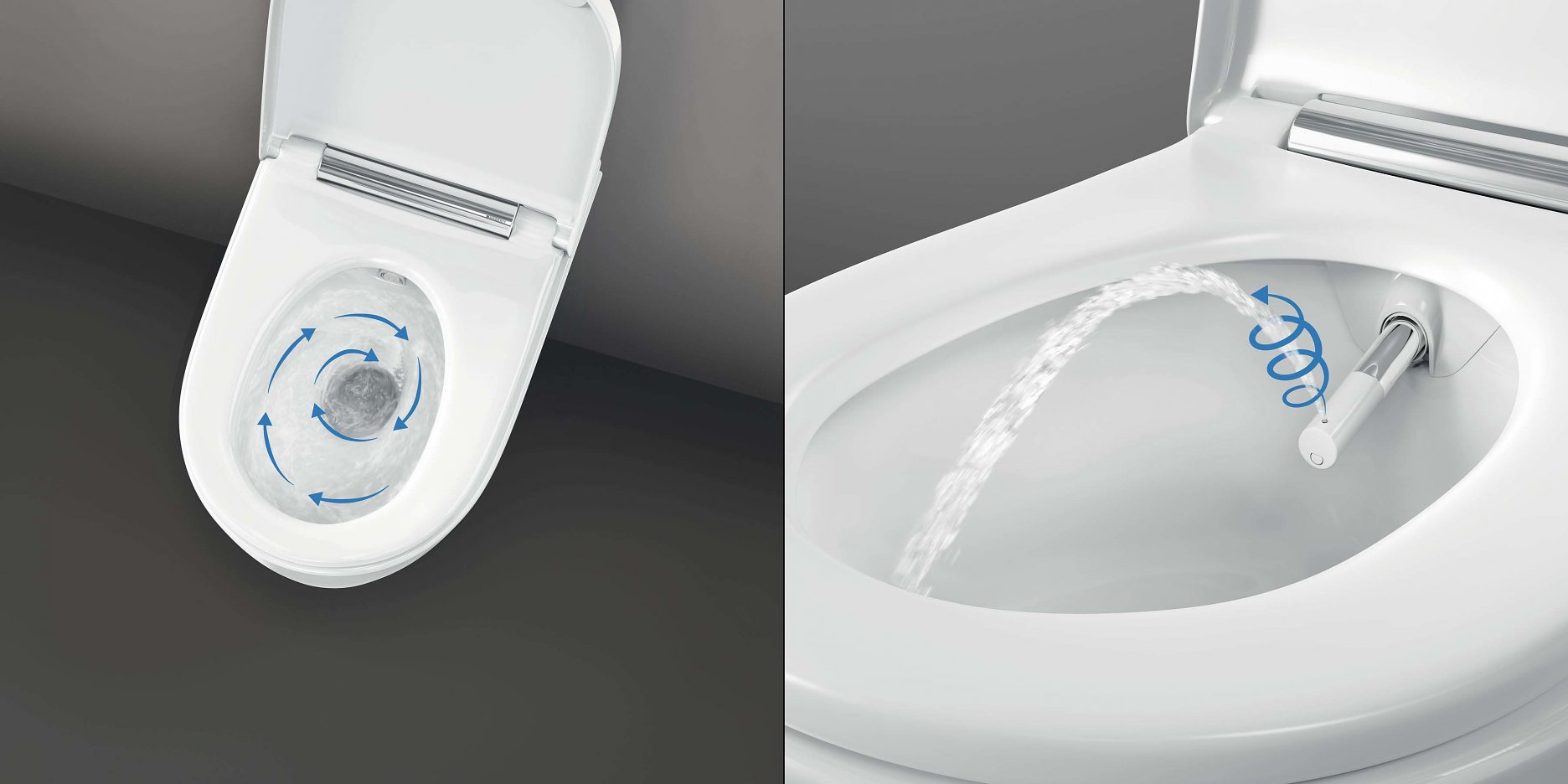 Technológia sprchovania WhirlSpray zabezpečuje dôkladnú a zároveň úspornú očistu vodou. Sprchovací prúd je zjemnený dynamickým primiešavaním vzduchu. Pomocou diaľkového ovládania je možné nastaviť polohu ramena sprchy ako aj intenzitu sprchovacieho prúdu v piatich stupňoch intenzity. Presne podľa osobných preferencií. Zároveň je možné aktivovať oscilačnú funkciu sprchovania pre ešte dôkladnejšie očistenie.