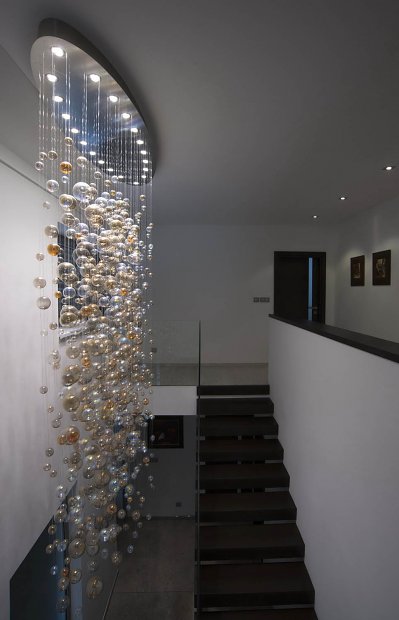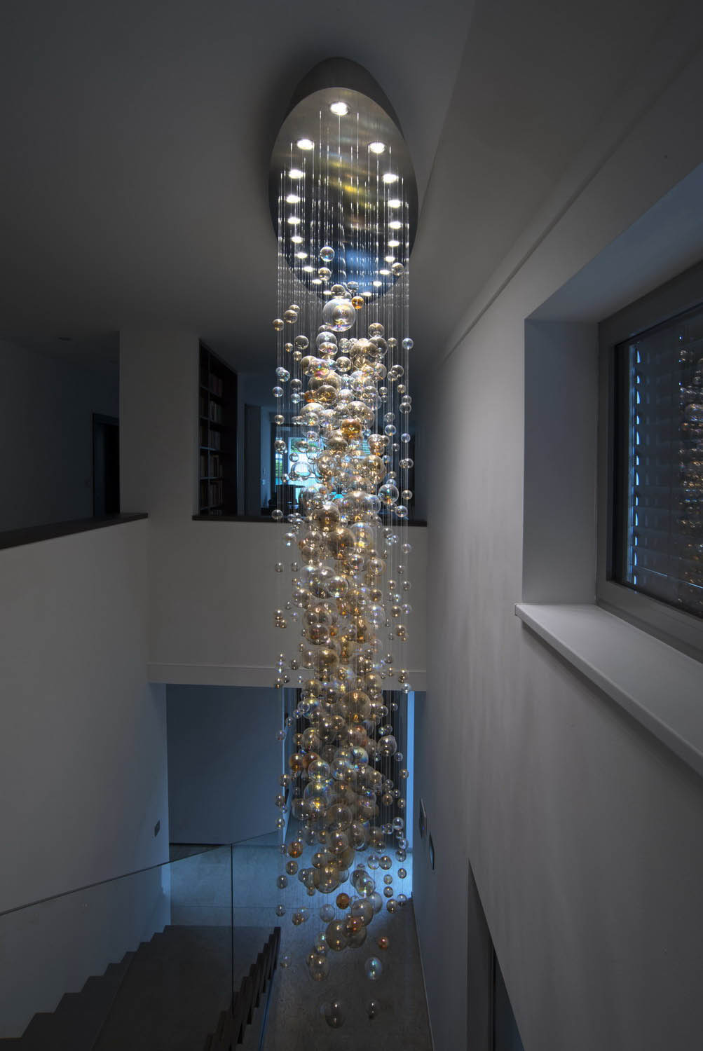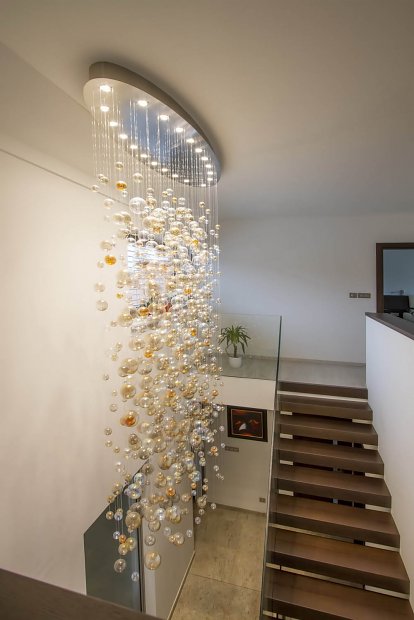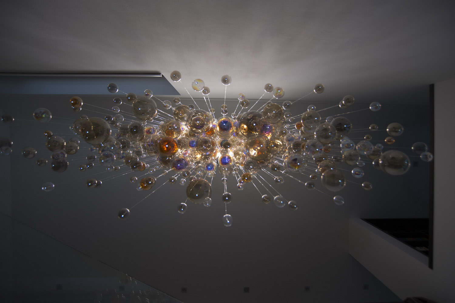Do moderných priestorov navrhnutý luster so stovkami sklených komponentov z ručne fúkaného skla. Bubliny pôsobia dojmom, akoby sa vznášali vo vzduchu a nádherne tak