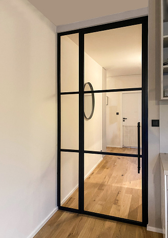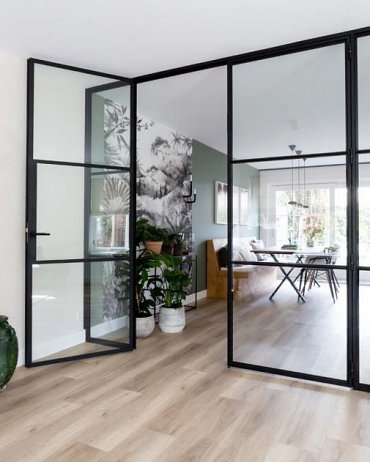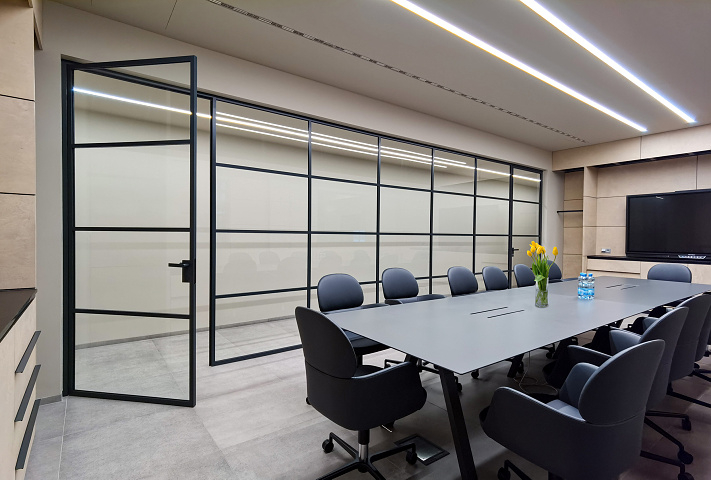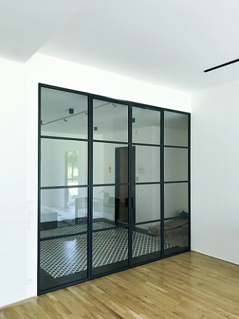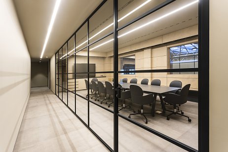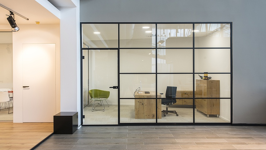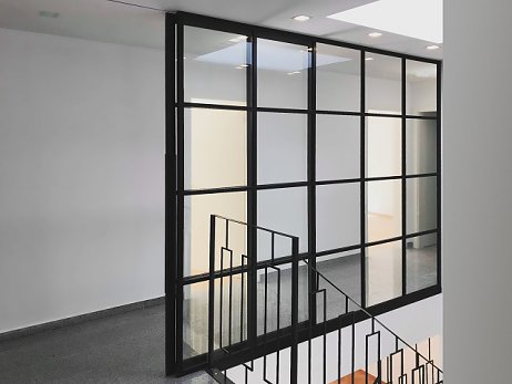 Pokud dělený prostor vyžaduje intimní atmosféru či hodně soukromí, lze použít skleněnou desku v povrchové úpravě Satinato. Industriální dělící příčky rozjasní interiér nejen svým vzhledem, ale i schopností propouštět světlo.