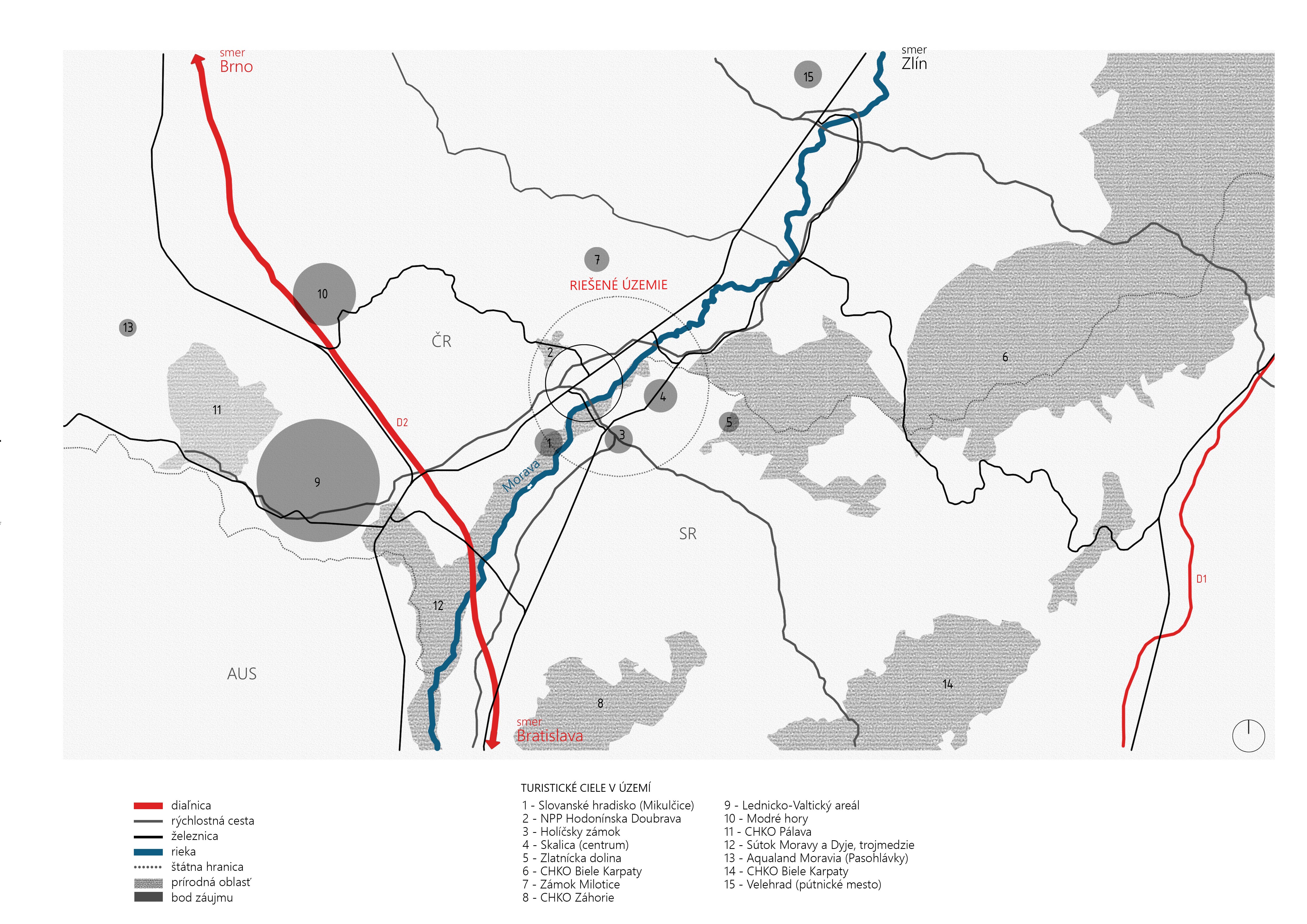 3. Rieka ako spojovací prvok územia, orientácia miest k rieke; Rieka Morava je dominantným prvkom celého územia, s jej charakteristickými ramenami a lúžnými lesmi v jej okolí, by nemala pôsobiť v území „rozdeľujúco“, preto je treba posilniť jej charakter ako ideovej spojnice regiónu, zároveň posilňovať vzťah miest ku jej ekosystému.