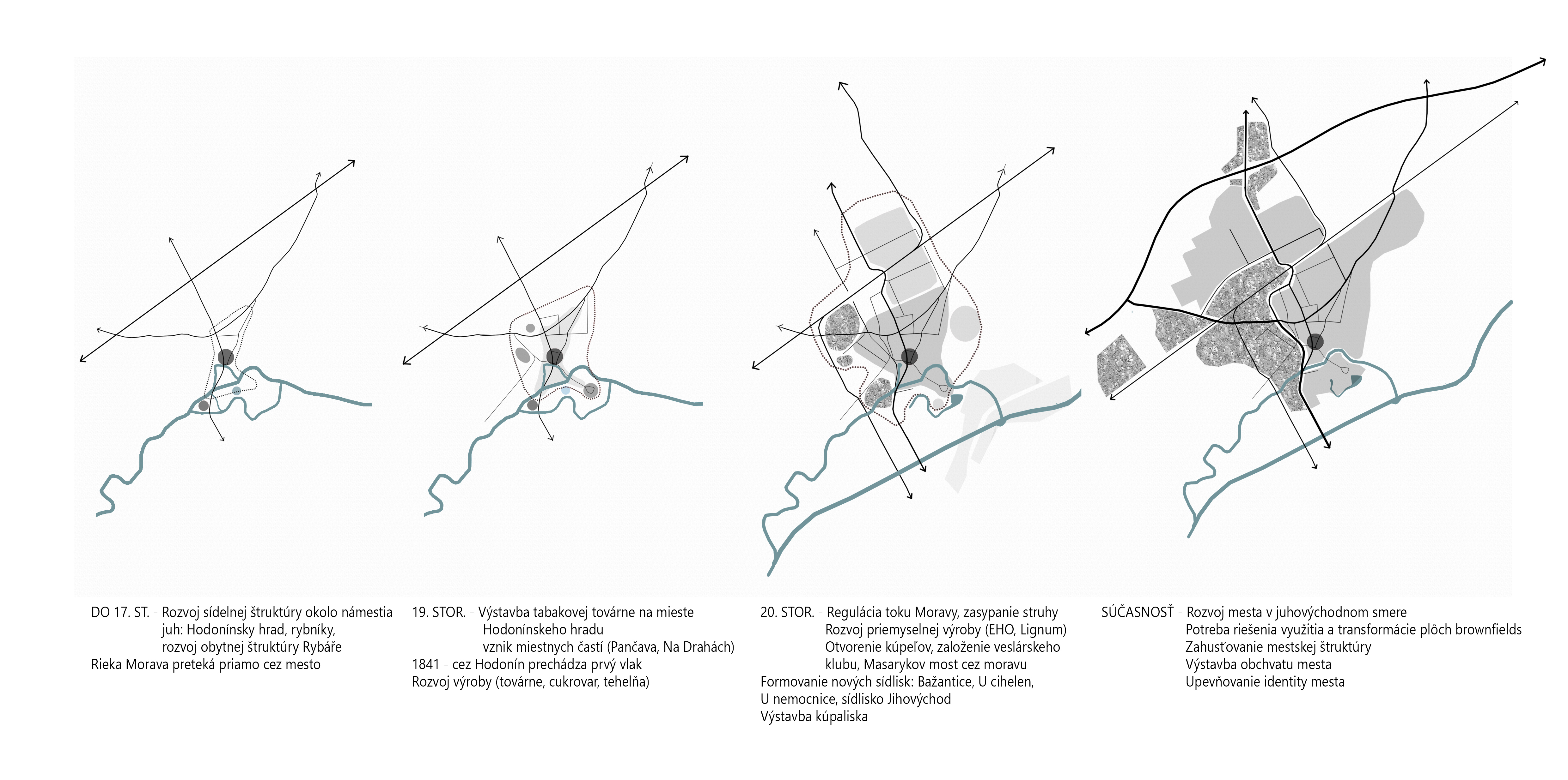 Cieľom práce bolo transformovať urbanistickú štruktúru južnej časti českého mesta Hodonín, ktoré sa nachádza v Juhomoravskom kraji (cca 70 km juhovýchodne od Brna), v blízkosti toku rieky Moravy, v kontakte so štátnou hranicou Slovenskej republiky. Mesto má bohatú industriálnu minulosť, ktorá mu prepožičiava charakter industriálneho mesta. Taktiež je sídlom liečebných kúpeľov „Lázně Hodonín“, zoologickej záhrady a v jeho okolí sa nachádza veľa turistických bodov záujmu. V južnej časti mesta, blízko historického centra sa nachádza rozsiahle územie v kontakte s industriálnou zónou, ktoré sa dá označiť ako brownfield. Nachádza sa tu zachovalý areál bývalej tabakovej továrne, ktorého budovy sa v súčasnosti využívajú ako skladové priestory, čím je potlačený jeho potenciál ako najdôležitejšieho industriálneho dedičstva mesta. Vybudované je tu funkčné kúpalisko a futbalový štadión. V blízkosti centrálneho námestia je situovaná budova Masarykovho múzea, ako aj modernistické budovy starého kultúrneho domu a sauny. Oblasť má existujúci prírodný potenciál; územím preteká rieka Stará Morava, v okolí ktorej sa rozprestiera mestská zeleň, ktorá však nie je dostatočne využívaná. V práci sú spomenuté potenciály územia využité ako prirodzené body záujmu, ktoré dobudovávajú a podporujú súčasnú sieť verejných priestorov a vytvárajú nové fungujúce prepojenia medzi nimi. Dôraz je kladený na dotváranie existujúcej urbanistickej štruktúry; definovanie a uzatváranie urbanistických blokov, ako aj na vytváranie nových plôch bývania rozmanitej kvality v rámci terajšej štruktúry mesta. Vyzdvihnutie potenciálov územia (tabaková továreň, rieka) a nadviazanie na ne novými štruktúrami upevňuje funkčnosť a organizáciu mestského organizmu v tomto území.
