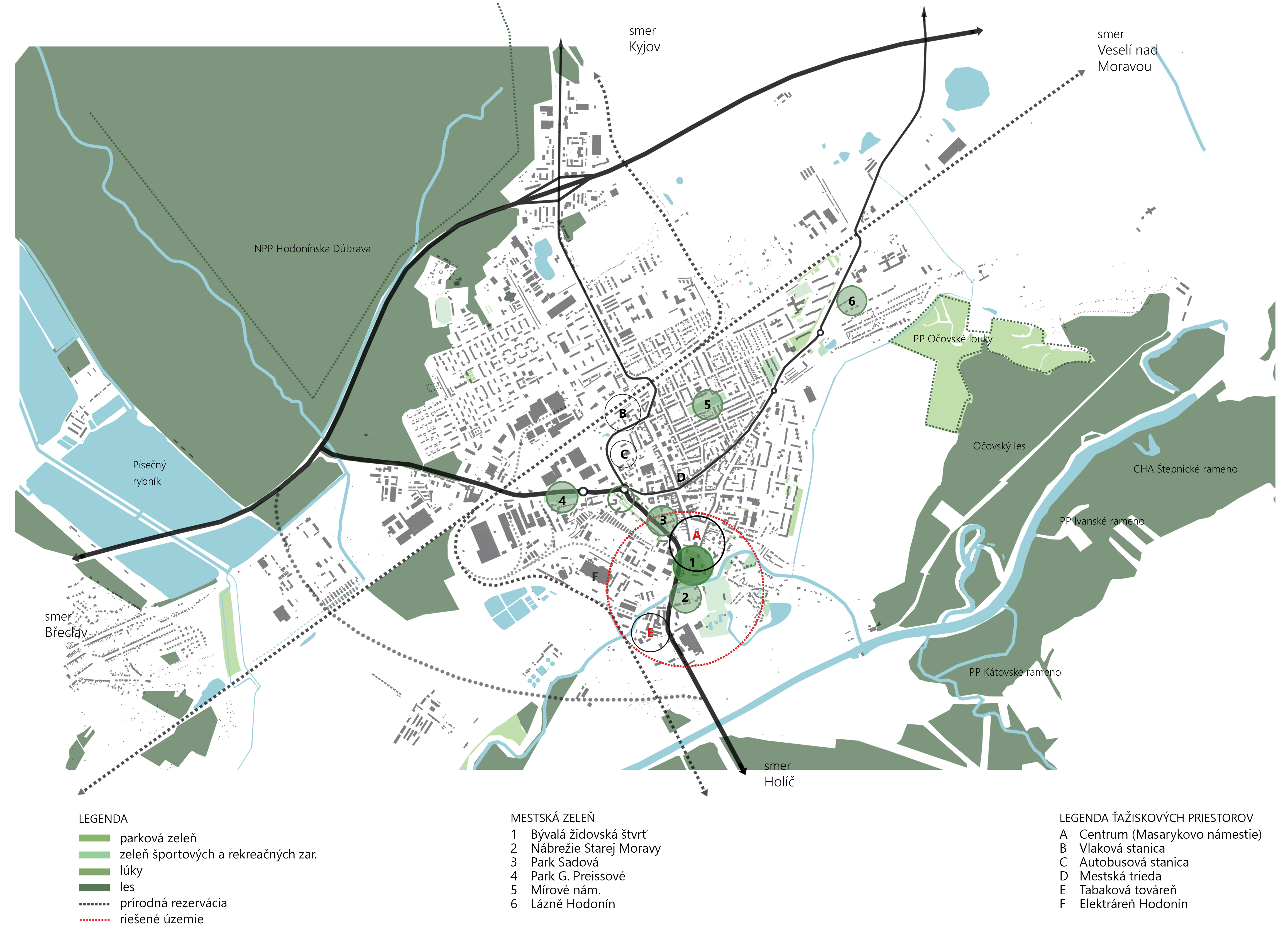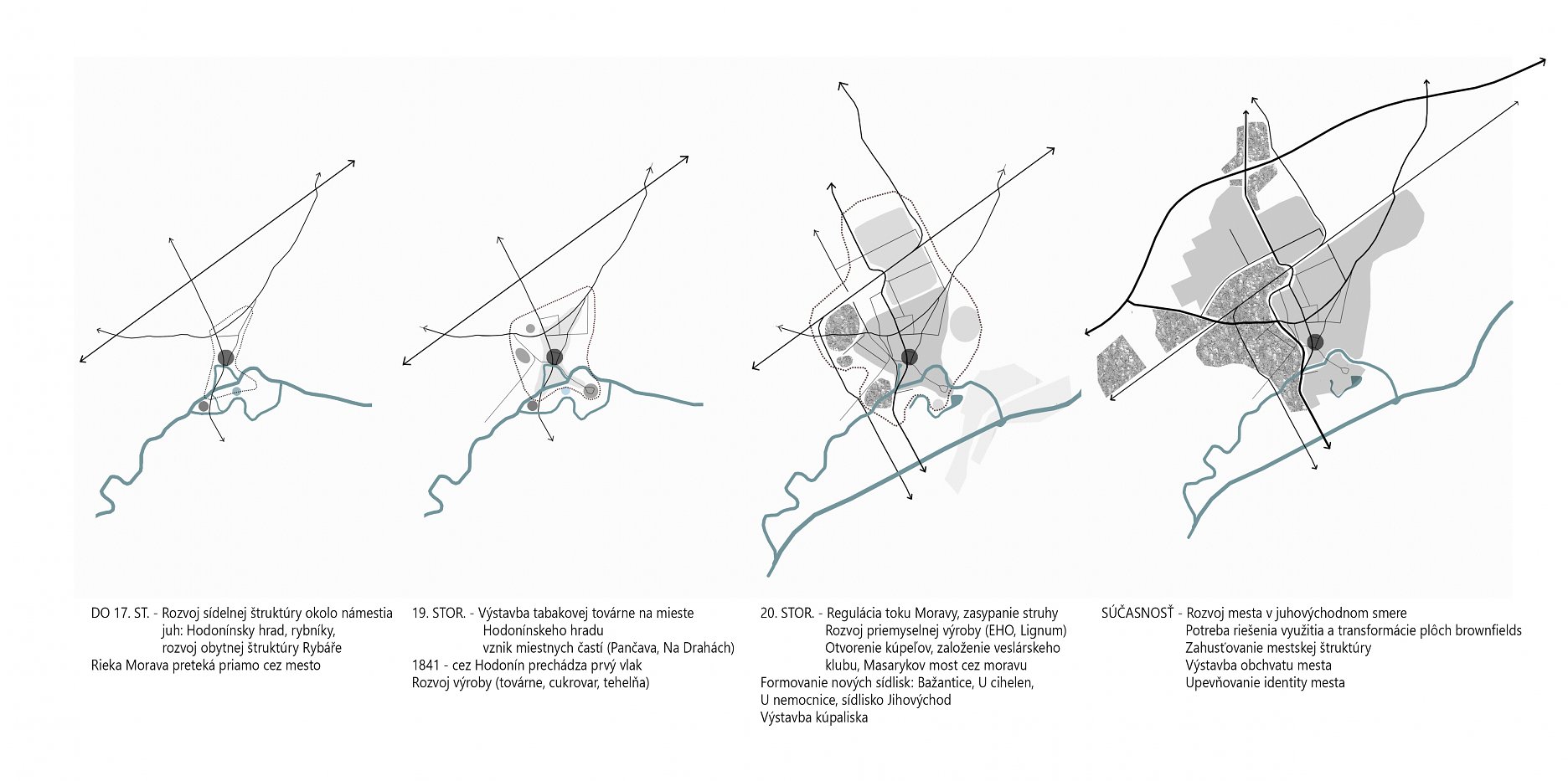Riešenie diplomovej práce „Transformácia urbanistickej štruktúry Hodonína“ voľne nadväzuje na druhú a tretiu časť navrhovanej etapizácie z preddiplomového semináru: Pritiahnutie ľudí k rieke, orientovanie urbanizmu smerom k rieke. Vytváraním nových priestorov v meste, ich orientácia na rekreačný charakter miesta a zahusťovanie štruktúry mesta podporuje jeho životaschopnosť. Taktiež dôležitým prvom je dobudovanie cyklotrás a vytváranie zaujímavých chodníkov a trás v okolí toku rieky Starej Moravy pretekajúcej samotným mestom.