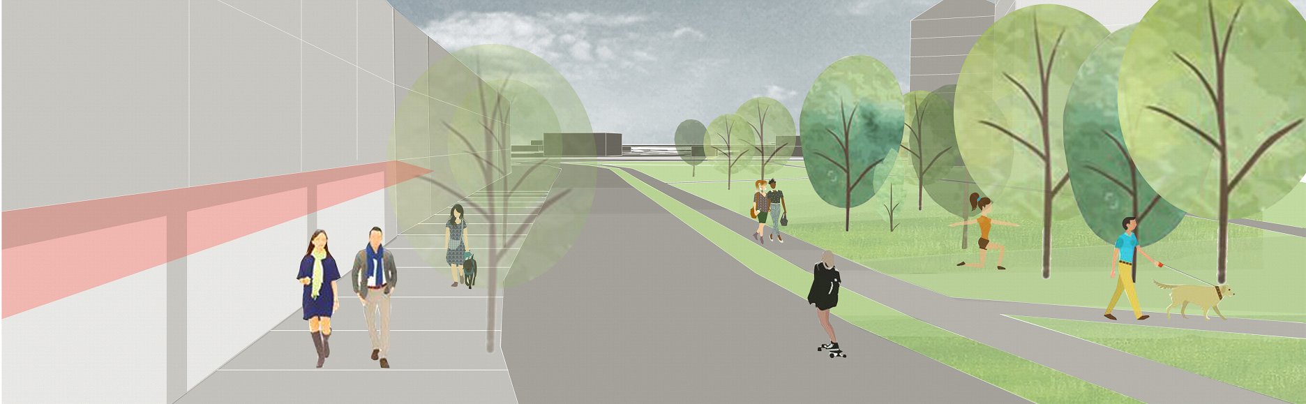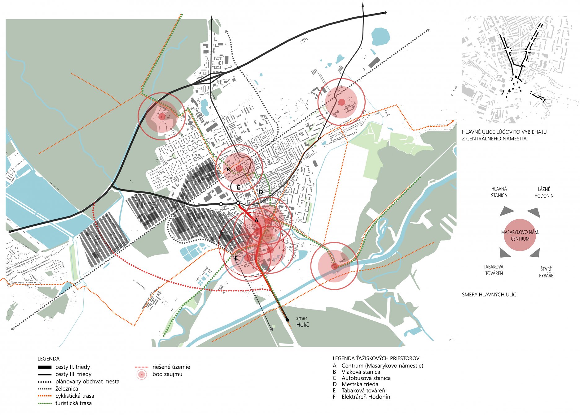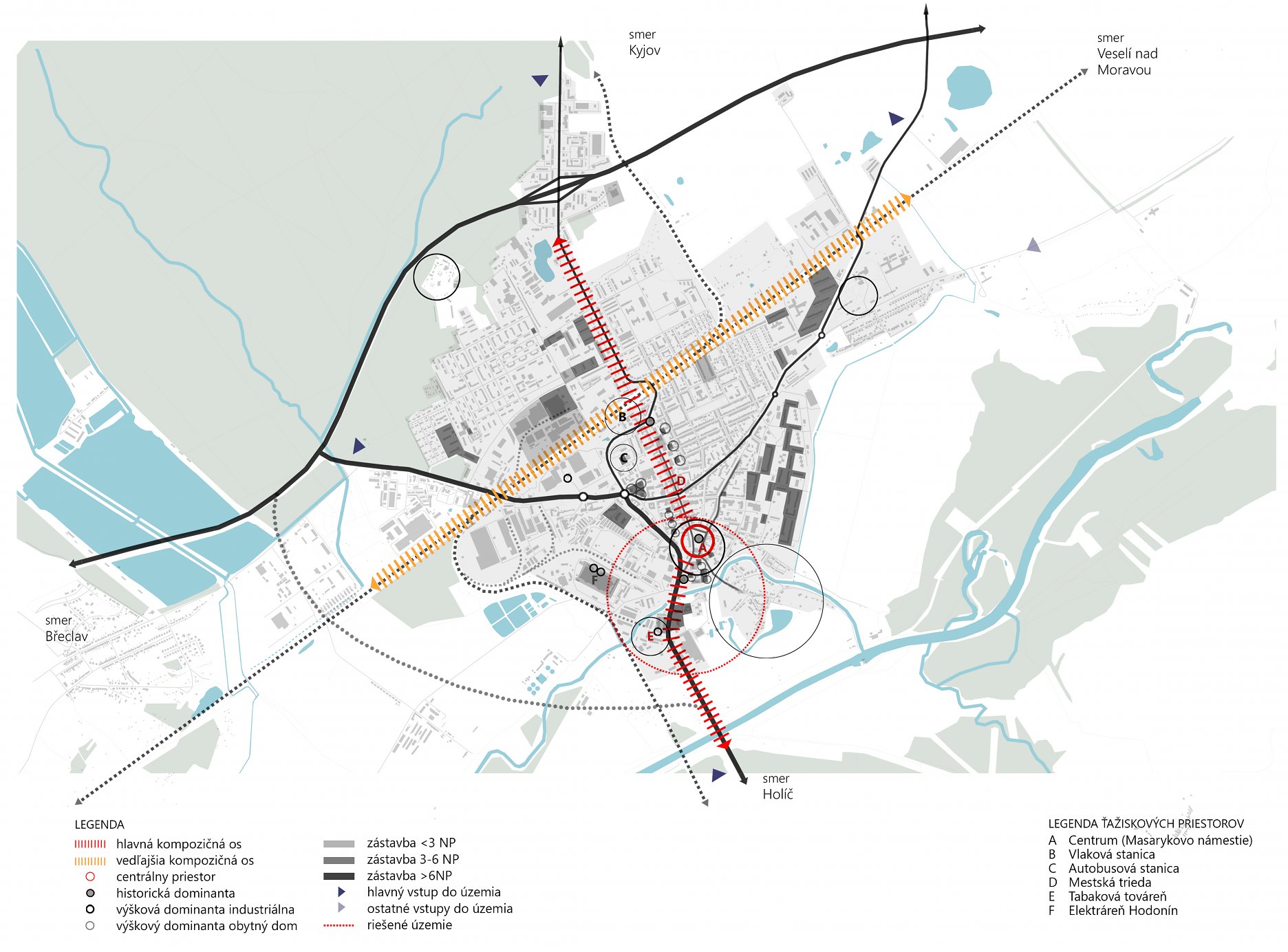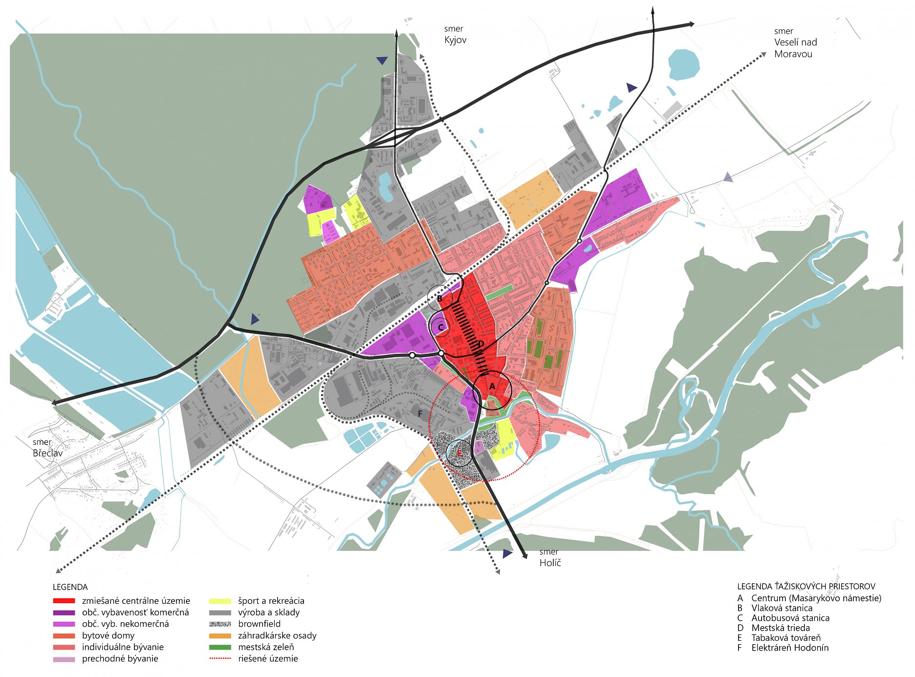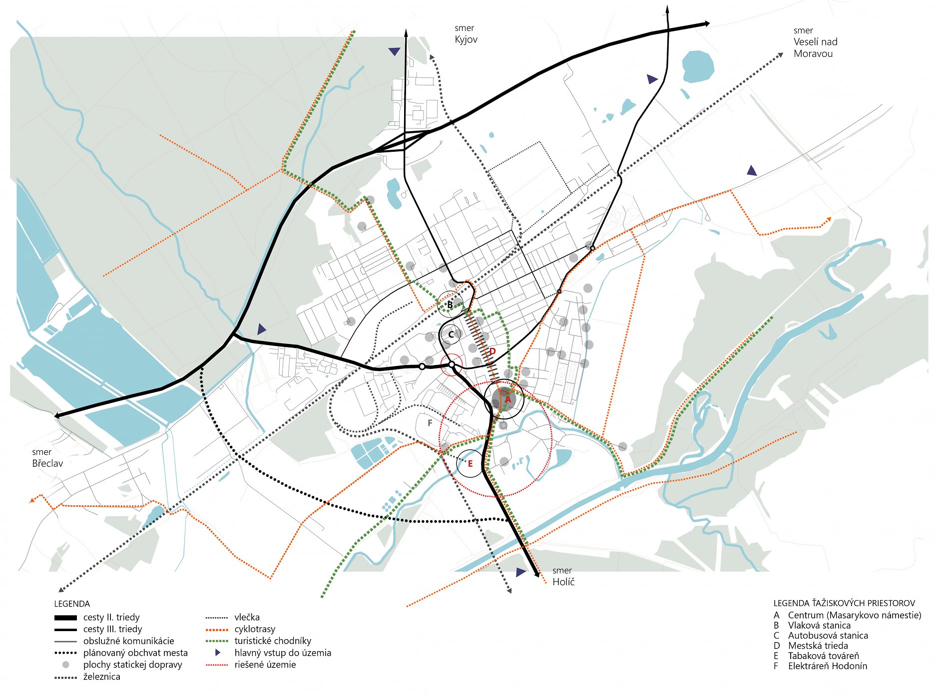 Pre vznik dobre fungujúcej mestskej štruktúry bolo v prvom rade potrebné ukľudniť dopravu na rýchlostnej ceste prechádzajúcej územím, a to za pomoci vybudovania západného obchvatu mesta, ktorý tranzitnú dopravu v meste odľahčí a umožní vznik novej mestskej triedy a jej prislúchajúcich priestorov. Vytvorenie mestskej triedy súvisí z vznikom kvalitatívne nových priestorov, ktoré podporujú a priťahujú do oblasti „mestský život“. Zároveň dochádza k uvoľneniu priestoru v okolí Hodonínskeho zámku, ktorý má tak možnosť stať sa plnohodnotným akcentom územia, s nadväzujúcim Zámockým námestím, ktorého predĺženie siaha až k modernistickej budove bývalého kultúrneho domu a budove bývalej sauny. Tento priestor si zaslúži niesť „reprezentatívne“ a najmä mestotvorné funkcie, čo v súčasnosti nespĺňa, preto navrhujem obom budovám prinavrátiť ich pôvodný modernistický image. Budova bývalého kultúrneho domu by zastrešovala malé prevádzky, kreatívne ateliéry a kino, a budova sauny by obnovila svoju pôvodnú funkciu. Došlo by tak k vytvoreniu nástupného bodu do ďalšieho územia.