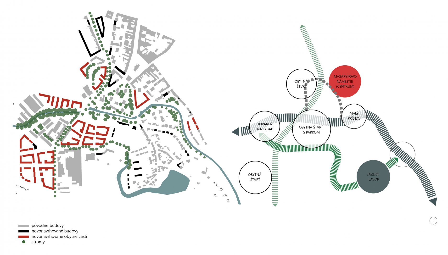 Zo štúdia historíckých máp mesta vyplýva, že mestom kedysi dávno pretekala rieka Morava, s ramenami v severnej i južnej časti. Neskôr bol tok rieky upravený, ramená čiastočne alebo úplne zasypané a v súčasnosti rieka preteká južne od mesta, a cez mesto vedie tok Stará Morava, ktorý sa západne za mestom vlieva do veľkej Moravy. Návrh počíta s odkazom na historickú stopu bývalých ramien rieky, ktorá by poukazovala na minulosť mesta a zároveň by dotvárana jeho štruktúru vytvorením nových priestorov. Stopa severného ramena by bola koncipovaná ako verejný priestor, ktorý nadväzuje na zeleň bývalého židovského mesta, zatáča sa smerom dolu a končí sa pri budove bývalého kultúrneho domu. Priestor by bol obklopený novonavrhnutými budovami ako aj jednou už stojacou, s variabilnými priestormi využiteľnými ako na bývanie, tak na administratívne priestory ako aj občiansku vybavenosť. V južnej časti by na východnú časť jazera Lavor nadväzovala „promenáda“, ktorá by prechádzala v stope južného ramena medzi futbalovým štadiónom a kúpaliskom, a pokračovala južnou časťou novonavrhovanej obytnej zóny s aktívnym parterom, vstupovala do areálu bývalej tabakovej továrne, kde by pomyselne končila pri toku Starej Moravy.