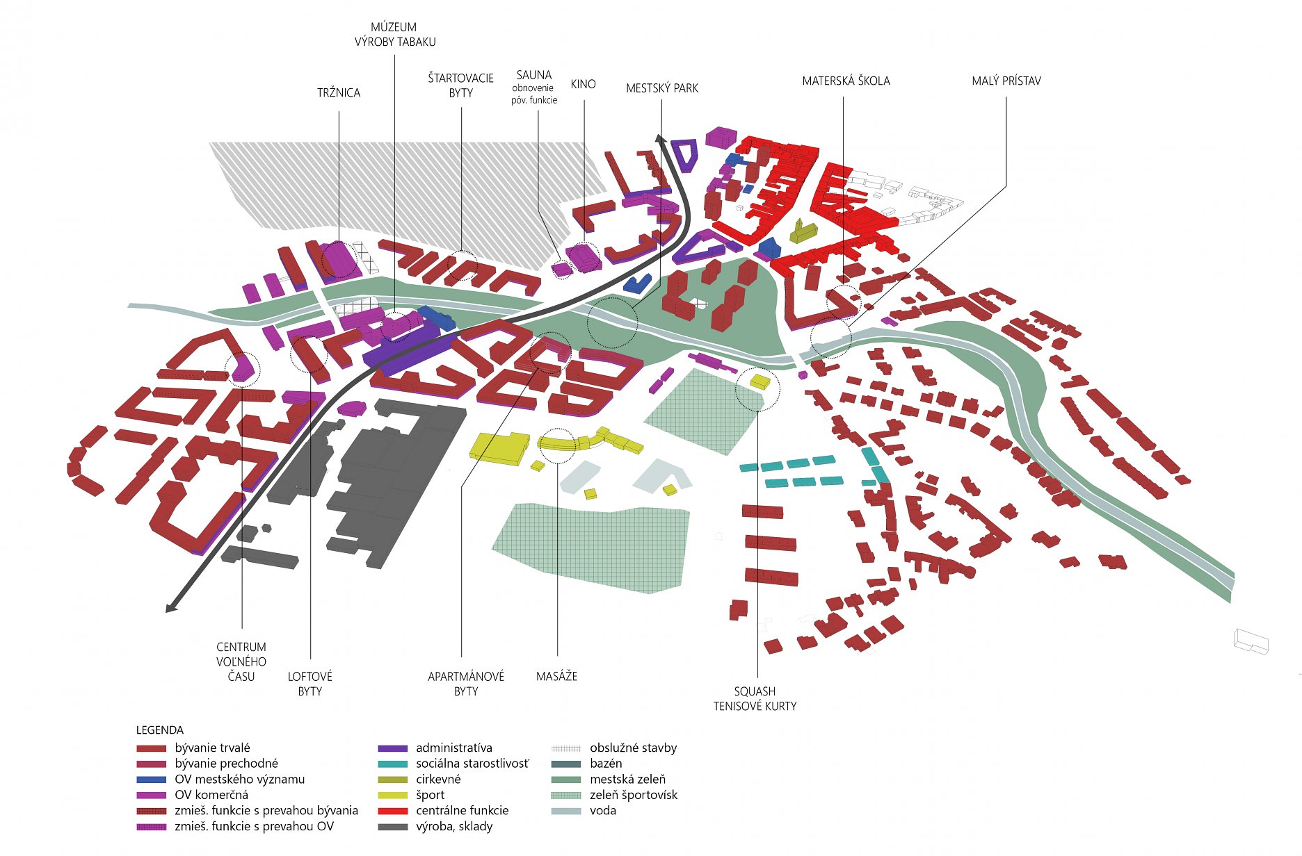 Ako už bolo spomenuté, dôležitým bodom územia je areál bývalej tabakovej továrne. Je to miesto s industriálnym charakterom a komplexom zachovaných budov, ktoré majú potenciál dostať nové funkcie, ktoré zabezpečia ich plné využitie. Areál sa sa otvorí mestu, ktorému poskytne zázemie pre rôzne funkcie. Budovy areálu sú v dobrom stavebno-technickom stave, a ich dispozície sú vďaka predošlej funkcii variabilné, preto jednotlivé pavilóny budú môcť byť využívané na rôzne účely. Navrhované sú funkcie ako coworkingové priestory, ateliéry, loftové byty, občianska vybavenosť, tržnica, priestory na prenájom a múzeum výroby tabaku v hlavnej centrálnej budove. Priestory medzi budovami budú využité ako verejné priestory a hospodárske zázemie. Na „námestiach“ areálu sa môžu konať trhy, alebo rôzne spoločenské udalosti.