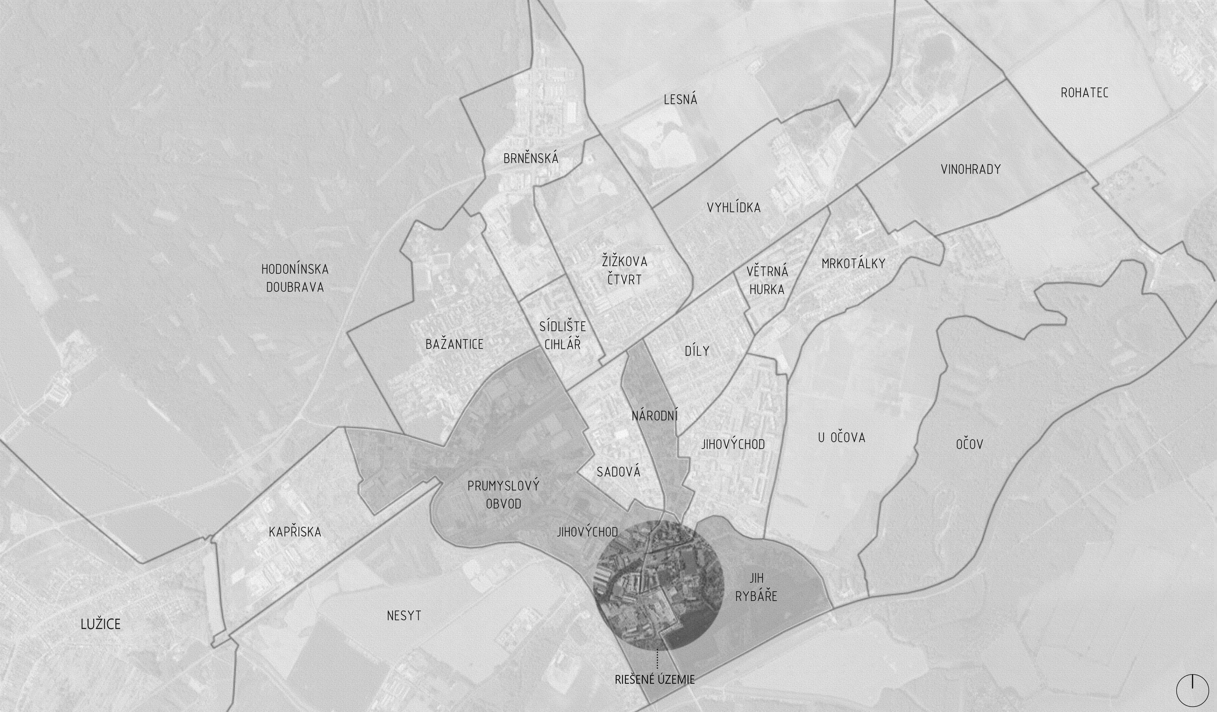 Riešené územie má južnú polohu v rámci mesta. Rozprestiera sa na ploche cca od budovy obchodnej akadémie v severnej časti, kde sa práca sústredí na dobudovanie existujúcej štruktúry do urbanistických blokov, a taktiež sa zameriava na kultiváciu okolia bývalej rýchlostnej cesty. V časti južne od toku Starej Moravy je to územie s málo rozvinutou urbanistickou štruktúrou, obsahujúce bývalú tabakovú továreň, plochu brownfield, kúpalisko a futbalový štadión, ako aj plochu brownfield po industriálnom areáli oproti výrobnému komplexu v najjužnejšej časti mesta vedľa Bratislavskej ulice.