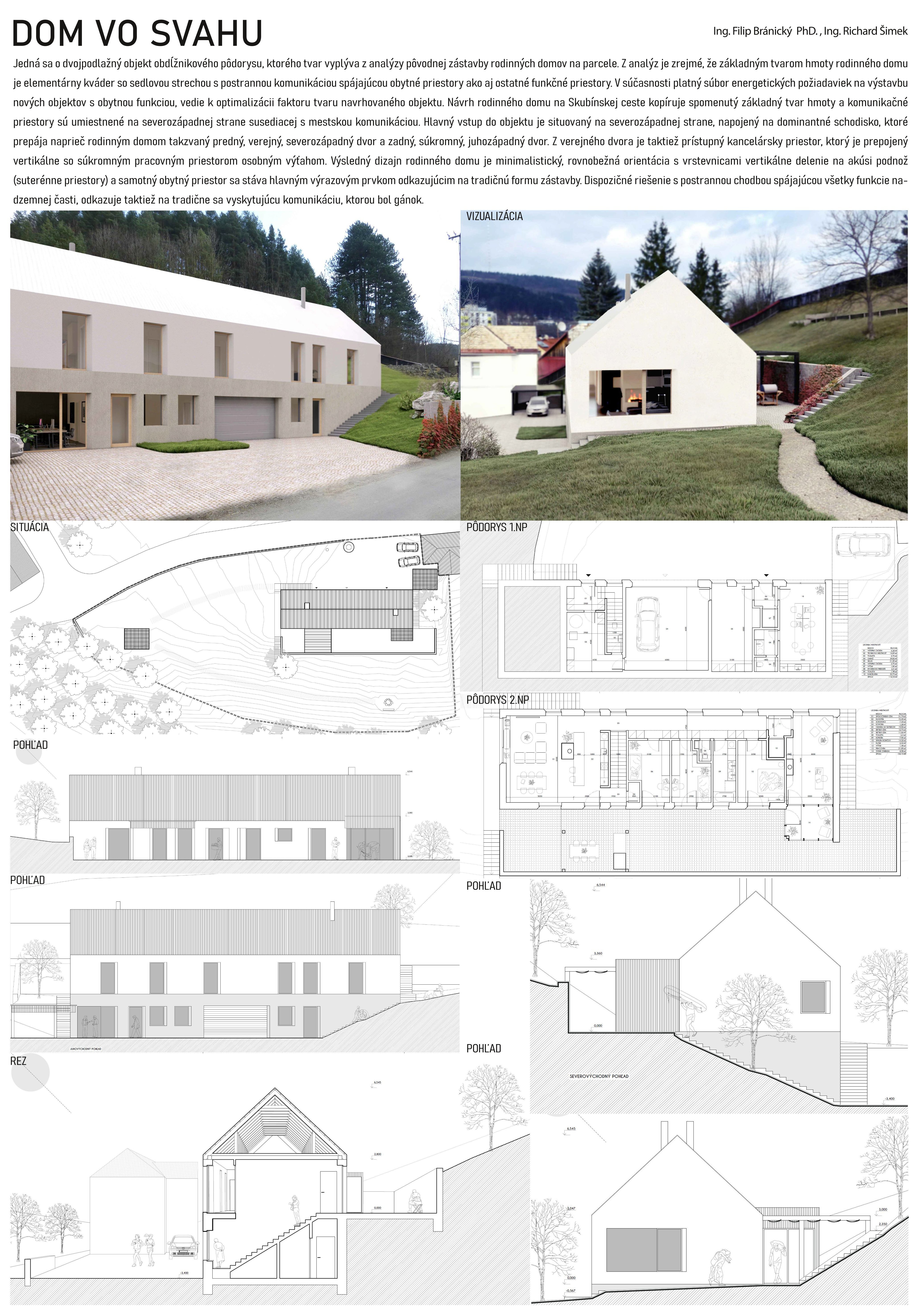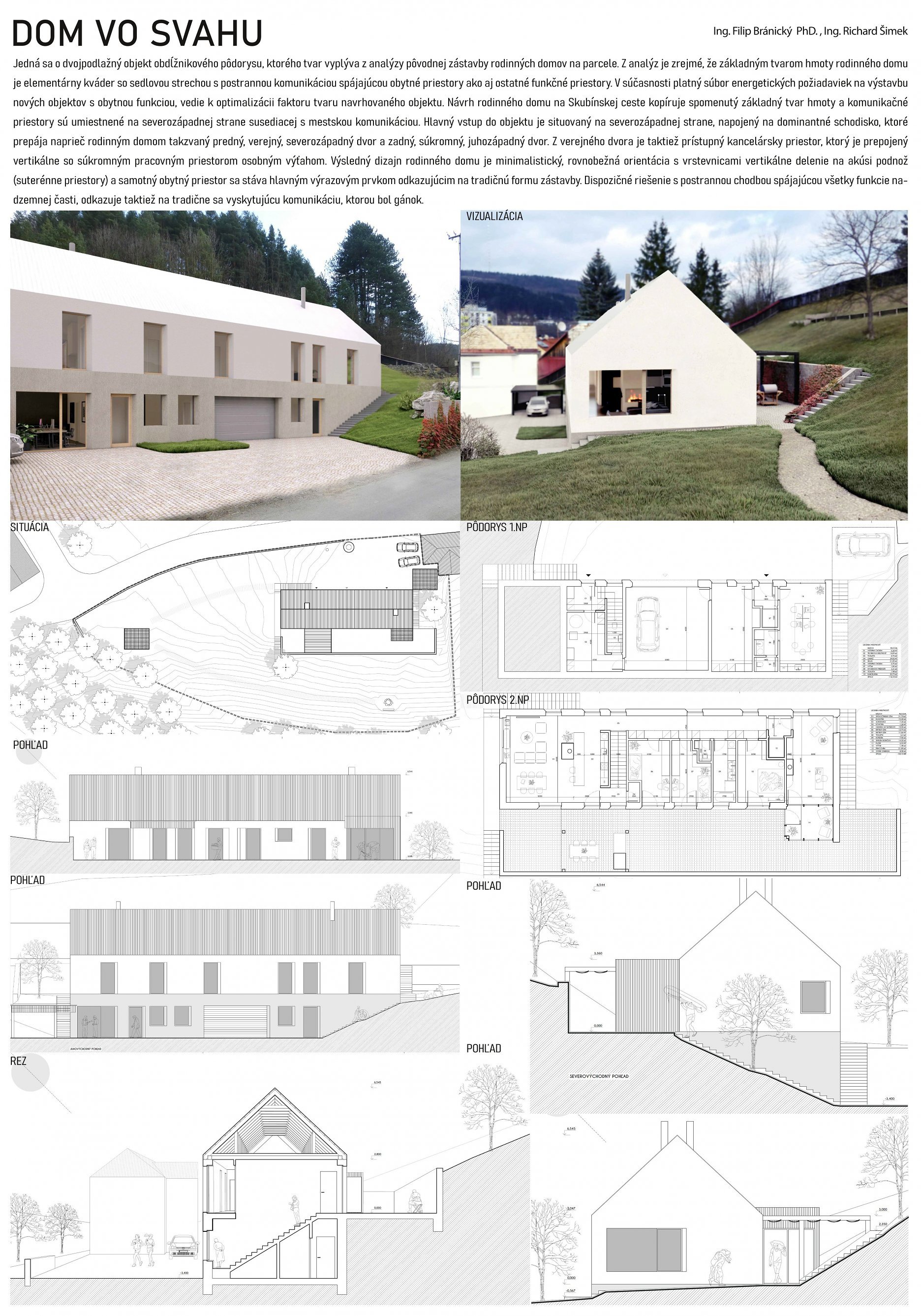 Dom vo svahu nadväzuje na okolitú zástavbu, hmota vychádza z pôvodného domu, ktorý stál na tomto mieste. Inšpirácia formou so sedlovou strechou pôsobí presvedčivo. Vizuálne sa naopak nesnaží pripodobňovať pôvodnému domu, má čitateľný súčasný charakter. Tento prístup vidieť aj v dispozícií domu, ktorá racionálne využíva orientáciu na svetové strany. Severnú a zároveň uličnú fasádu využíva na 2.NP ako prepojovaciu chodbu tvoriacu filter. Toto riešenie je taktiež inšpirované skladbou pôvodného domu s postrannou chodbou gánkového typu. Koncept tak jasne prezentuje východiskové riešenia z analýz.