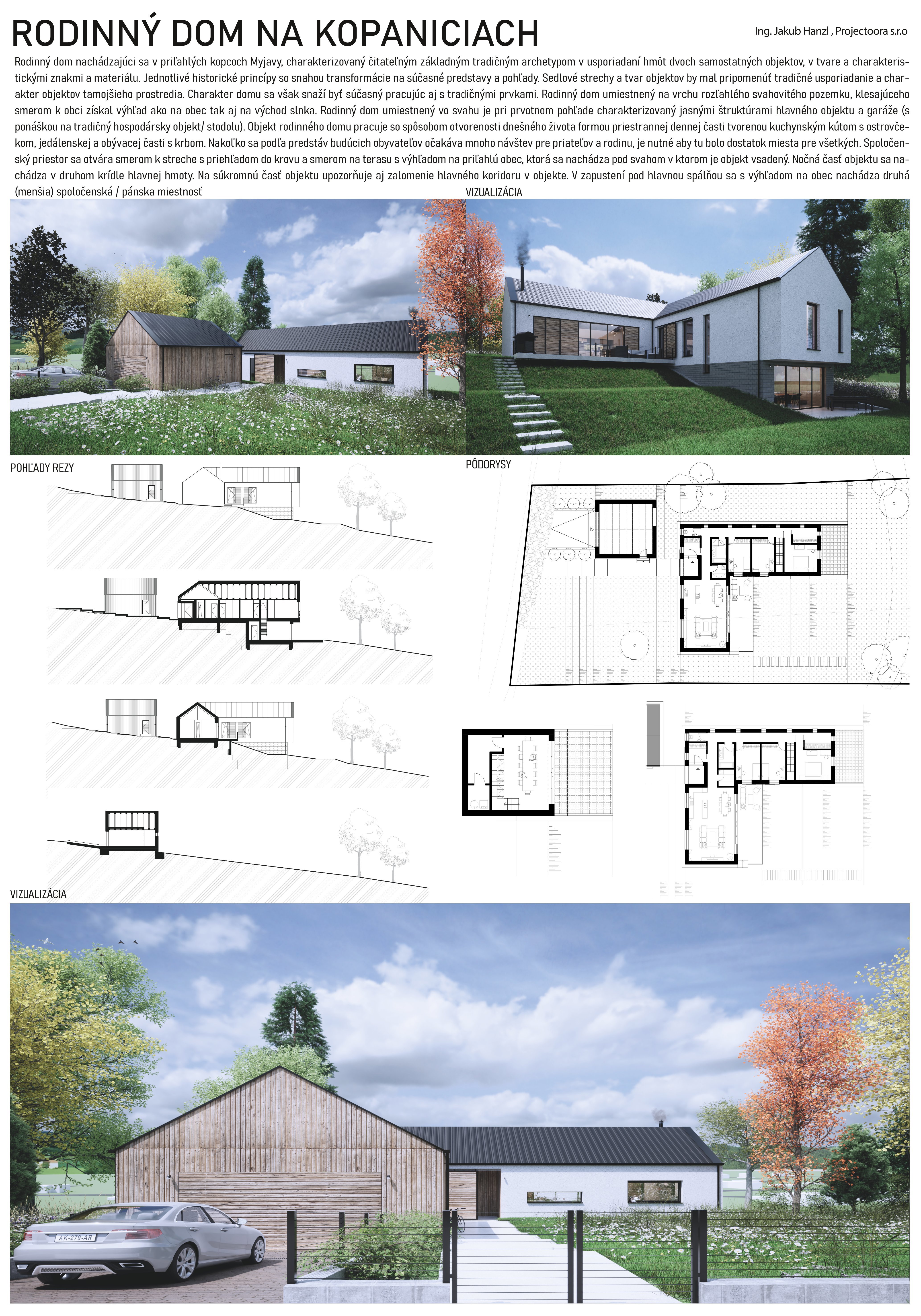 Návrh rodinného domu nad obcou Myjava je hmotovo riešený vhodne vzhľadom tradičnú štruktúru ľudovej architektúry. V minulosti hospodársky objekt, jasnej hmoty odčlenený od hmoty hlavného objektu. Dnes jeho funkcia transformovaná na dnešné požiadavky s logicky vyriešenou funkciou. Samotná hmota rodinného domu vychádza z tradičného dlhého vidieckeho domu, ktorého orientácia bola pootočená vzhľadom na morfológiu terénu. Z východnej strany už dom nepôsobí tradične, ale súčasne kde znakom tradičnej architektúry zostala abstrahovaná forma okenných okeníc. Vzhľadom na použité materiály, tak drevo v rámci „hosp. stavby“ či omietka a kameň hlavného objektu sú vhodnejšie zvolené materiály ako materiál (plech) a taktiež aj ako tmavá (antracitová až čierna farba) krytiny strechy.