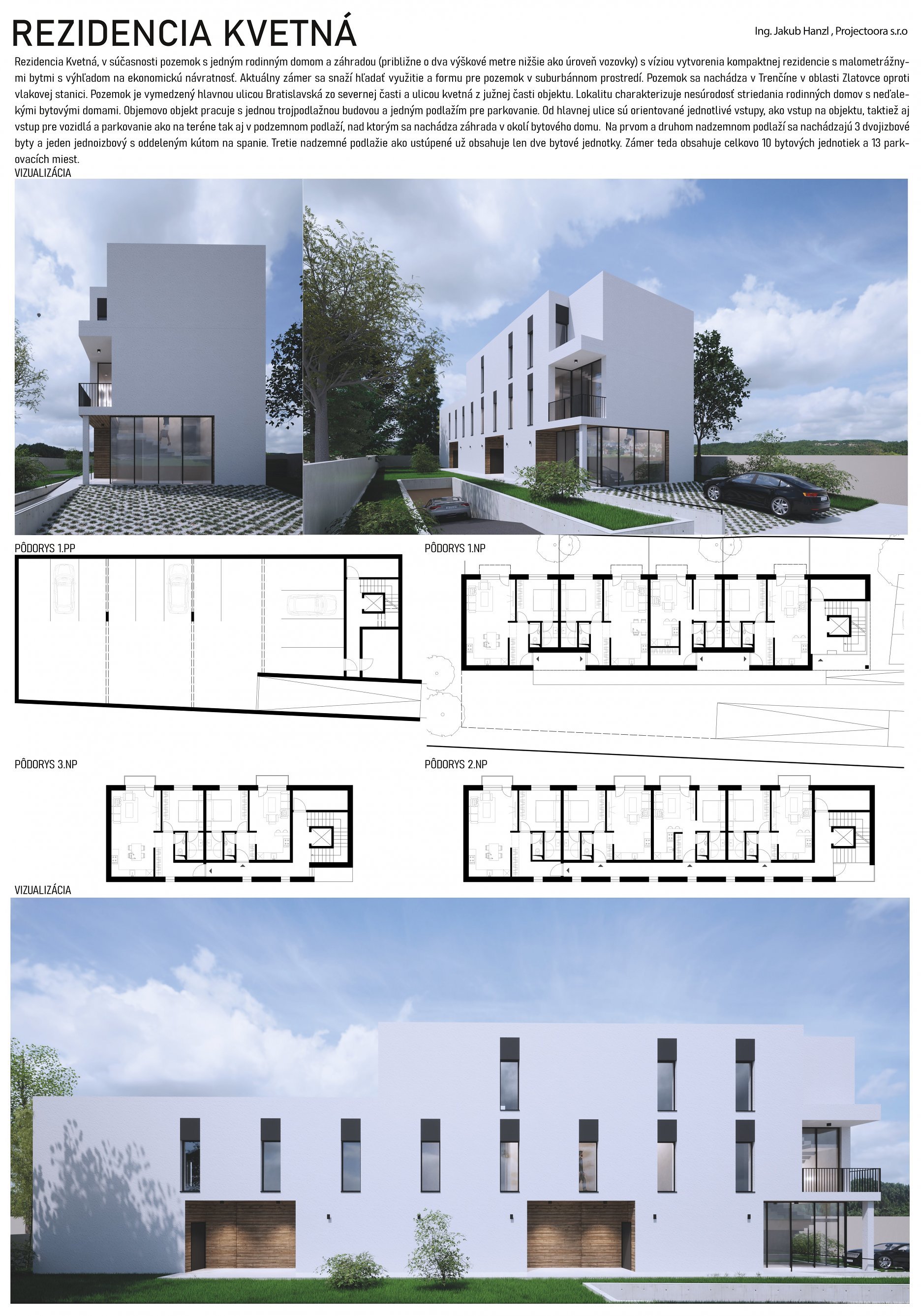 Rezidencia vznikajúca na ulici Kvetná v Trenčíne sa snaží hľadať využitie a formu pre pozemok v zložitom (sub)urbánnom kontexte. Architekt navrhuje jednu líniovú štruktúru bytového domu. Na pozemku využíva výškové rozdiely dvoch ulíc medzi ktorými sa nachádza v logický vjazd a umiestnenie podzemného podlažia. Nový objem vyčnieva ponad výšku menšej mierky okolitej zástavby, no zároveň dodržuje všetky regulácie oblasti. Projekt, ktorého náplňou sú predovšetkým garsónky, jednoizbové a dvojizbové byty vzniká so zreteľom na ekonomickú návratnosť.