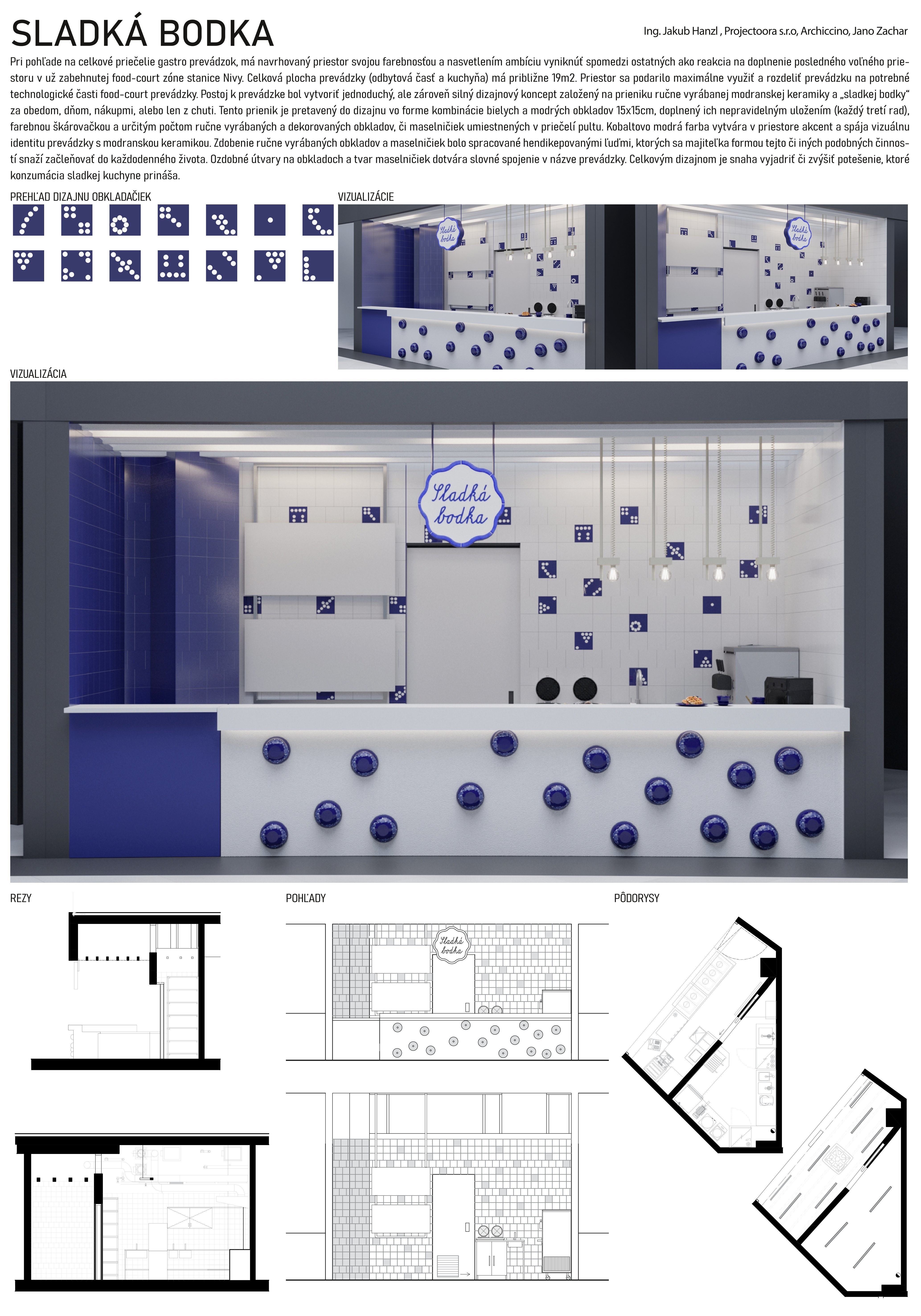 Návrh kaviarne Sladká Bodka je sympatický tým, že využíva lokálne remeselné zručnosti a nadväzuje na tradíciu modranskej keramiky. Tradičné modranské vzory inkorporuje do identity novej kaviarne a dáva im nový výraz. Architektonický návrh je spracovaný do detailu, kde architekt navrhol niekoľko typov vzorovaných obkladačiek. Unikátny vzor kachličiek tak môže byť ďalej využitý pre vizuálnu komunikáciu kaviarne.