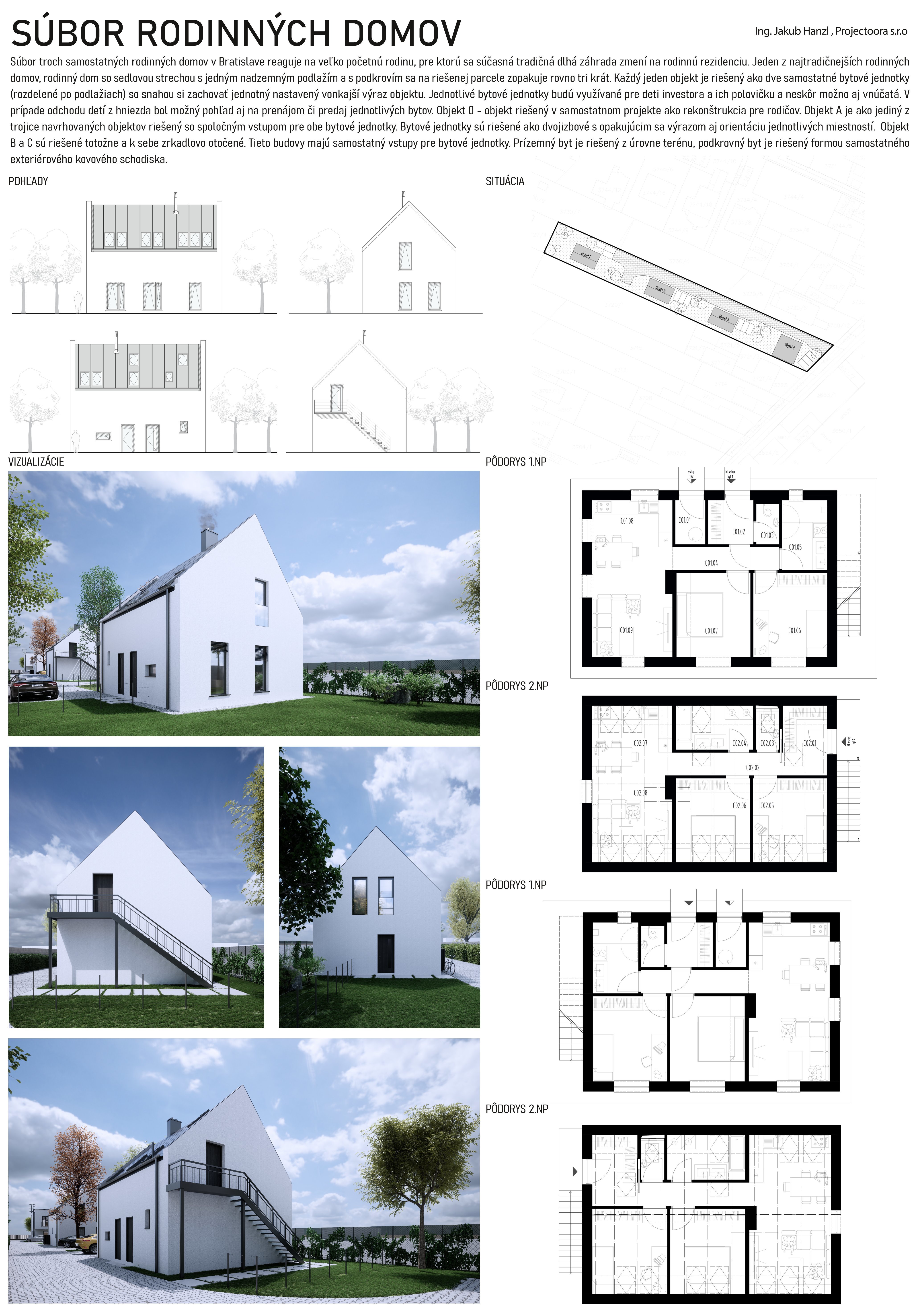 Zaujímavý návrh využitia dlhej úzkej parcely pre účely bývania v troch samostatných rodinných domoch. Každý rodinný dom bude mať dve samostatné bytové jednotky, ktoré budú obývané členmi rodiny, alebo budú v budúcnosti využívané na komerčný nájom. V bytových jednotkách na 2. NP by som navrhla zväčšiť okenné otvory v štítových stenách. Rozšírenie okien vylepší výhľad z obytnej miestnosti a zvýši celkovú kvalitu bývania. Na zváženie je tiež presun schodiska do pozdĺžnej časti domu, aby štíty domu mohli byť využité pre obytné miestnosti.