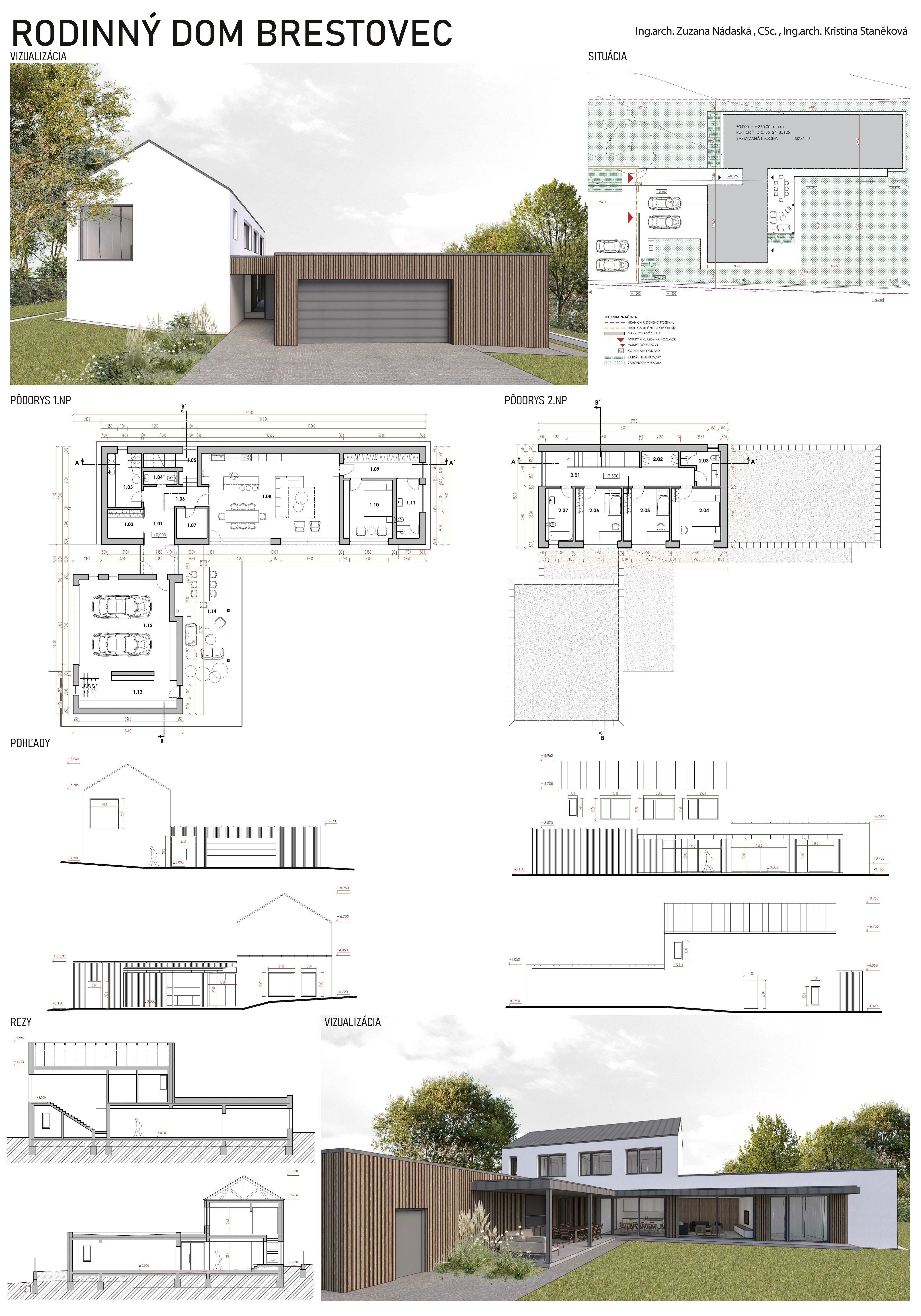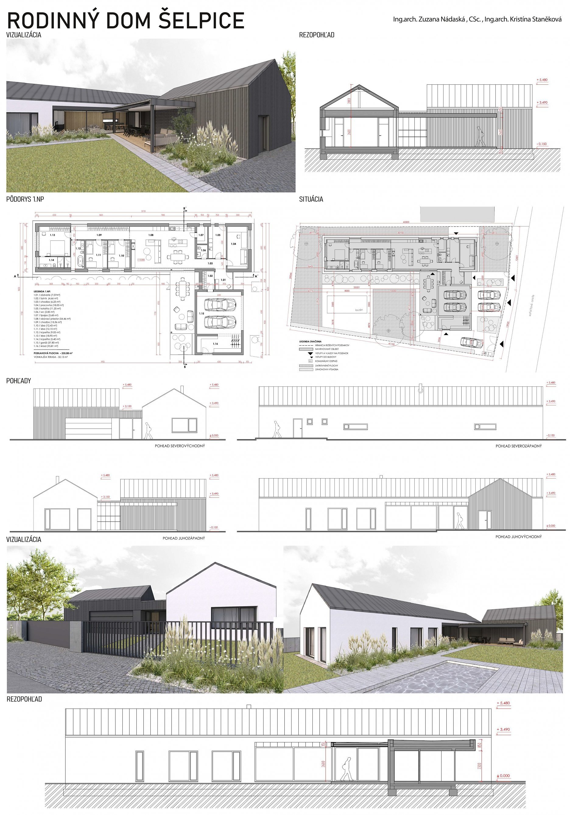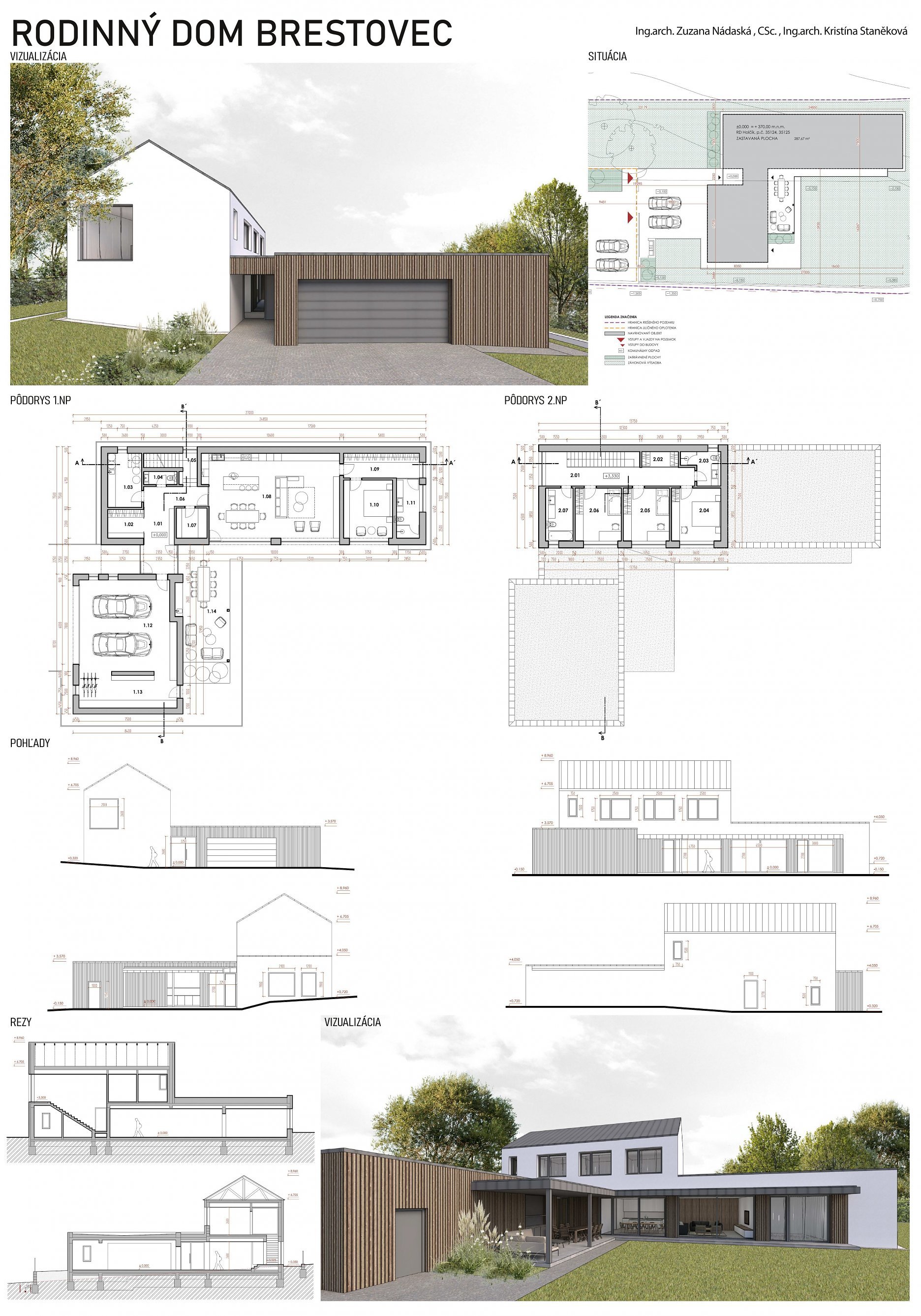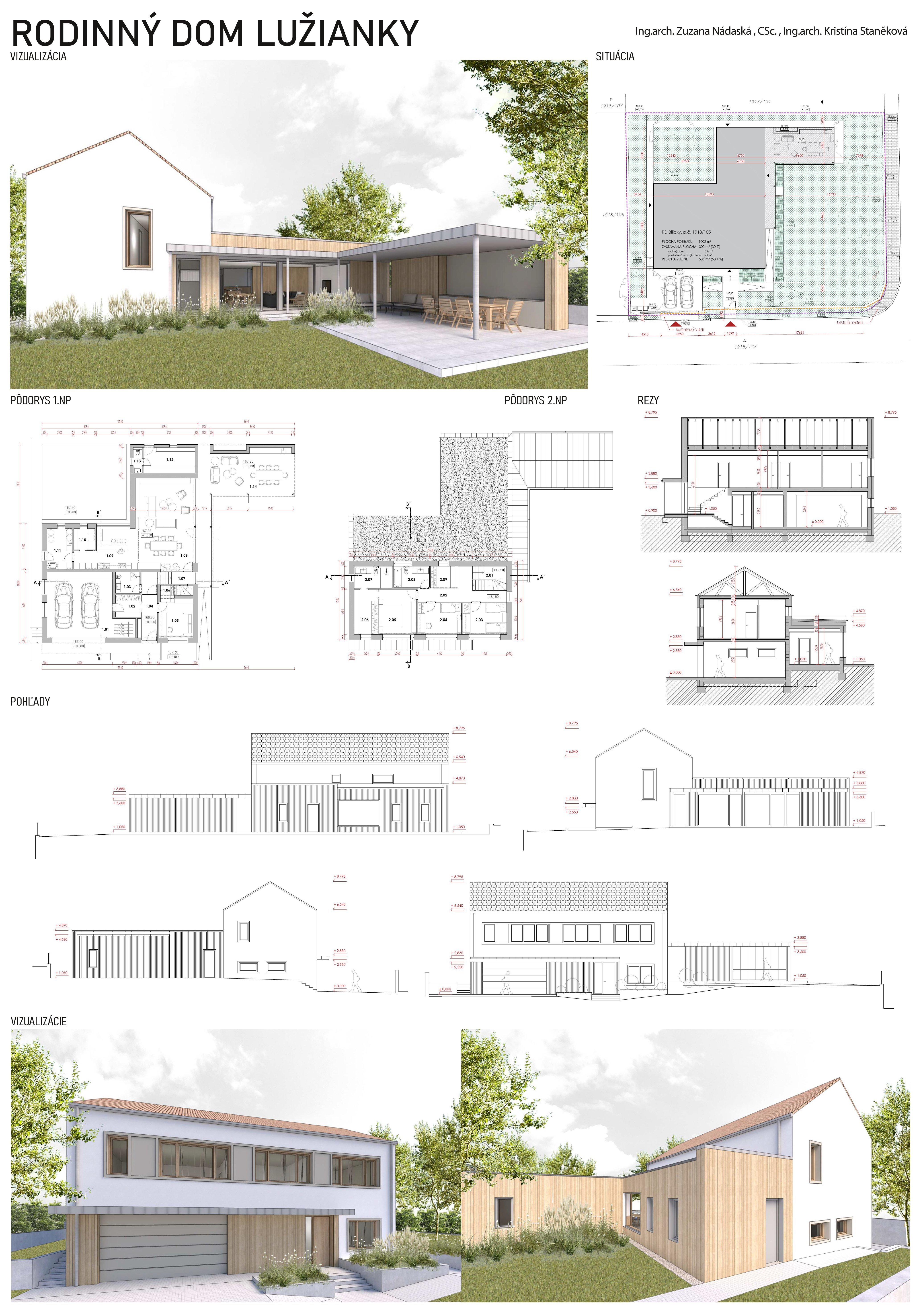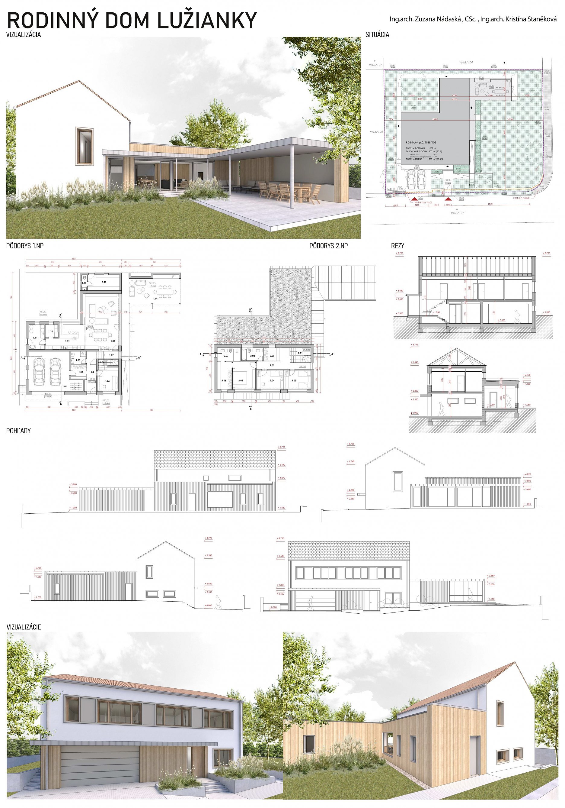 Rodinný dom je situovaný na pozemku definovanom dvoma výraznými líniami. Prvú tvorí vodný tok , ktorý je zároveň prirodzenou bariérou v kontinuálnej zástavbe. Druhú líniu predstavuje hlavná komunikácia, ktorej smer definoval stavebnú čiaru priľahlých rodinných domov. V návrhu je jasne čitateľná práca s daným kontextom, v ktorom navrhovaný dom uzatvára obytný blok. Autori vyosením objektu, do smeru rovnobežného s potokom, vytvárajú na južnej strane pozemku priestrannú záhradu, do ktorej sú orientované obytné priestory. Poloha garáže je optimálna pre pohodlný prechod k vstupu do domu a zároveň zabezpečuje súkromie od cesty. Hmota domu nesie proporcie tradičnej ľudovej architektúry, čo je vyjadrením pretrvávajúceho pozitívneho vzťahu k tradičnej forme zástavby aj v dnešnej dobe globalizmu. Tradičnú siluetu dopĺňajú nadčasové materiály a racionálne navrhnutá dispozícia, ktorá v dennej časti poskytuje vzdušný spoločenský priestor pre aktívne spolunažívanie rodiny.